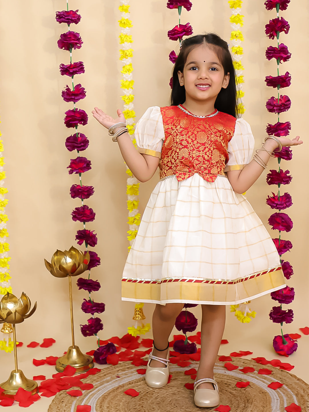 This elegant red jacquard dress from BownBee showcases short puff sleeves, adding a refined and timeless charm to the ethnic silhouette. Designed for comfort and sophistication, it’s an ideal choice for girls attending cultural events or celebrations, blending traditional craftsmanship with graceful style.