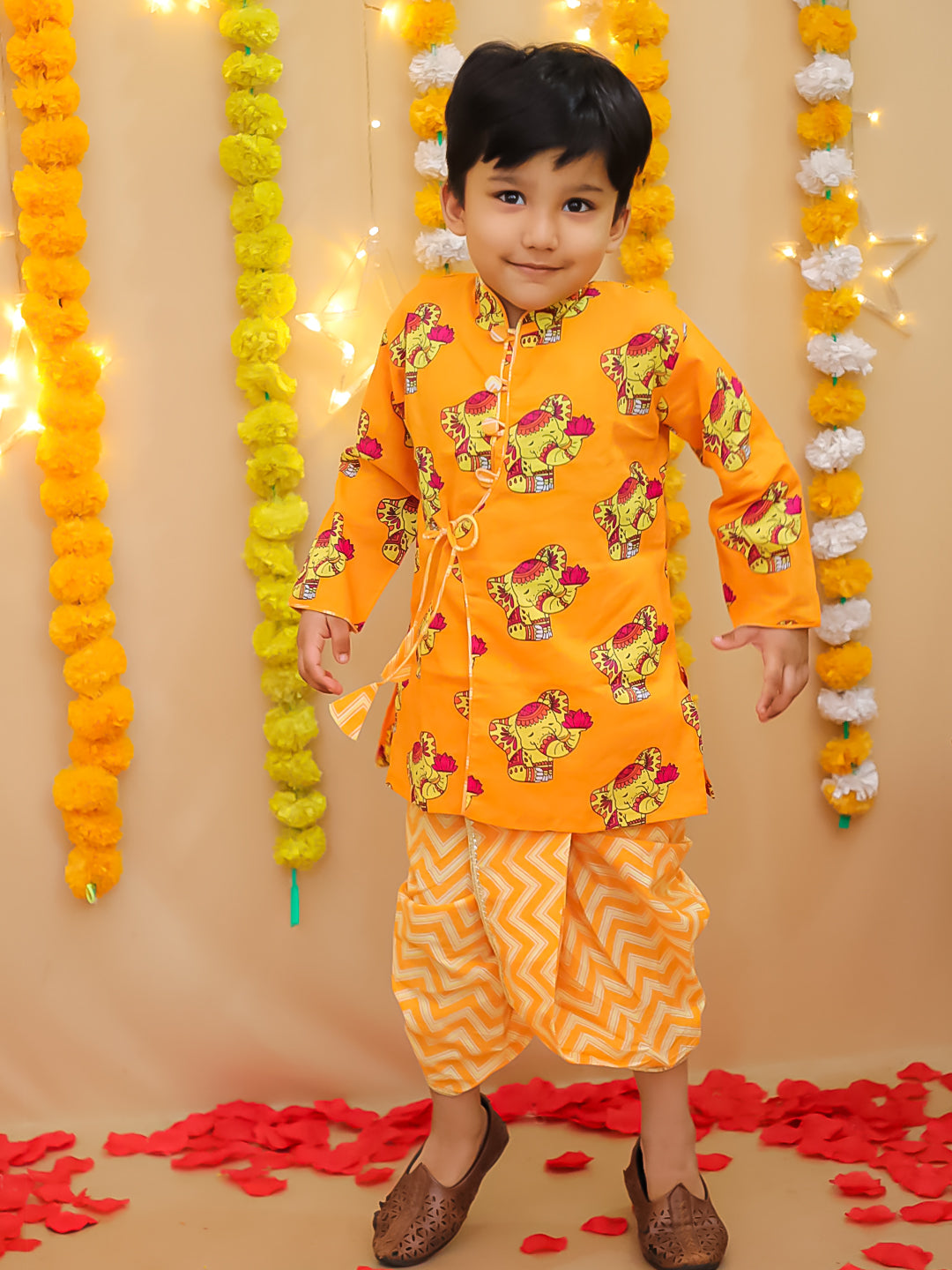 BownBee Pure Cotton Elephant Printed Dhoti Kurta For Infant Boys -Orange