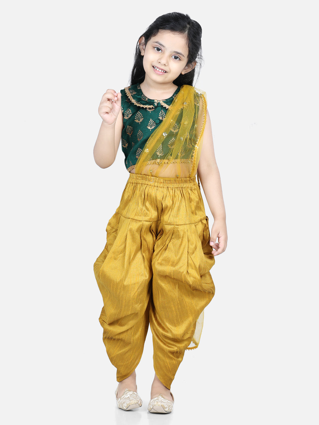 Introducing the BownBee Sleeveless Motif Woven Jacquard Top With Attached Dupatta Dhoti, available in green and yellow. Crafted from superior jacquard fabric, this top features a sleeveless design with intricate motifs and attached dupatta dhoti for an elevated look.