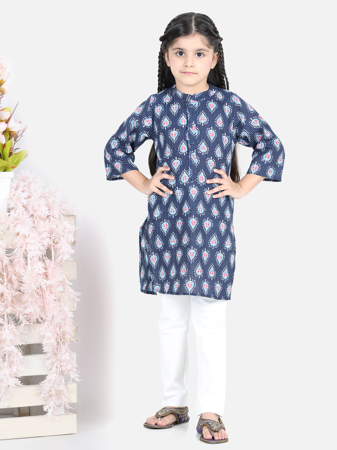 BownBee Three Fourth Sleeves Broken Striped & Seamless Motif Block Printed Kurta - Blue