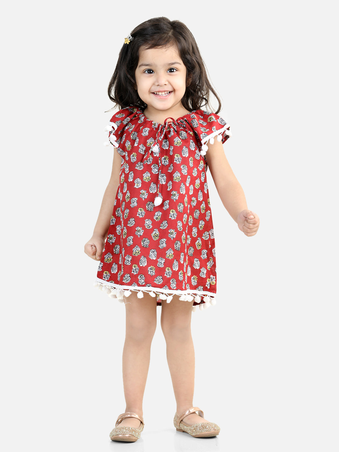 BownBee 100% Cotton Printed with Pompom Jhabla Frock for Girls- Maroon