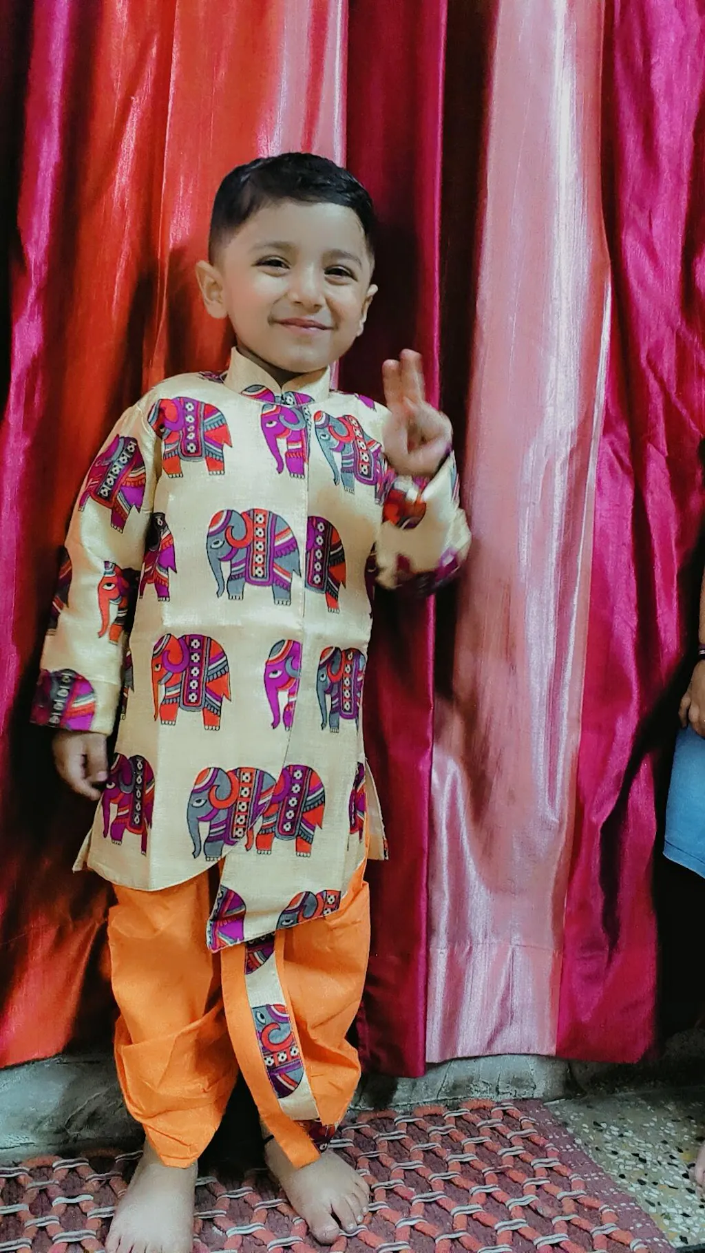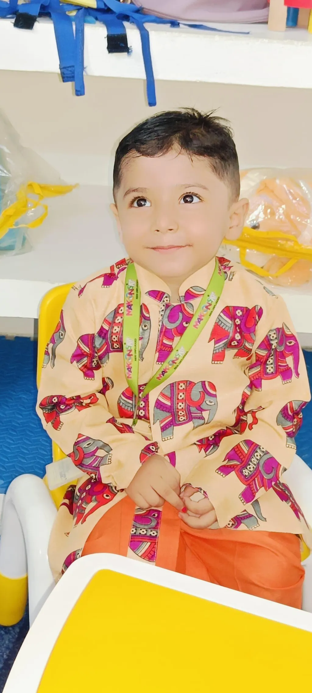 This BownBee Boys Sherwani is perfect for special occasions. Crafted with premium fabric, it features an orange-colored base with an ethnic animal Hathi print for a stylish look. It also has full sleeves to ensure optimum comfort and fit.