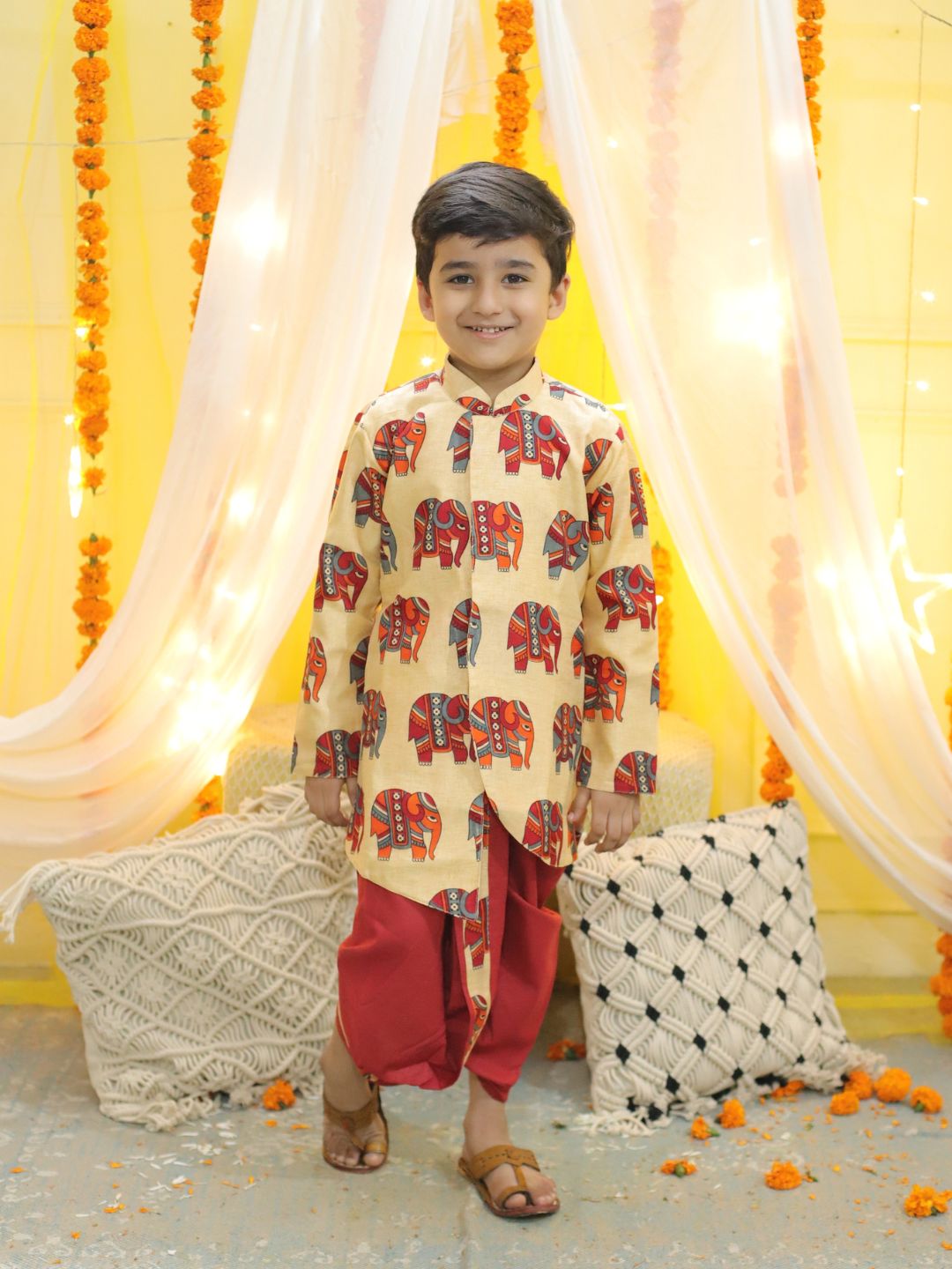 This BownBee Boys Ethnic Hathi Print Full Sleeve Sherwani is crafted from a superior quality fabric for a luxurious fit. It features an eye-catching Hathi print and full length sleeves, adding a traditional touch to any wardrobe. The bright red hue offers a perfect pop of color for special occasions.