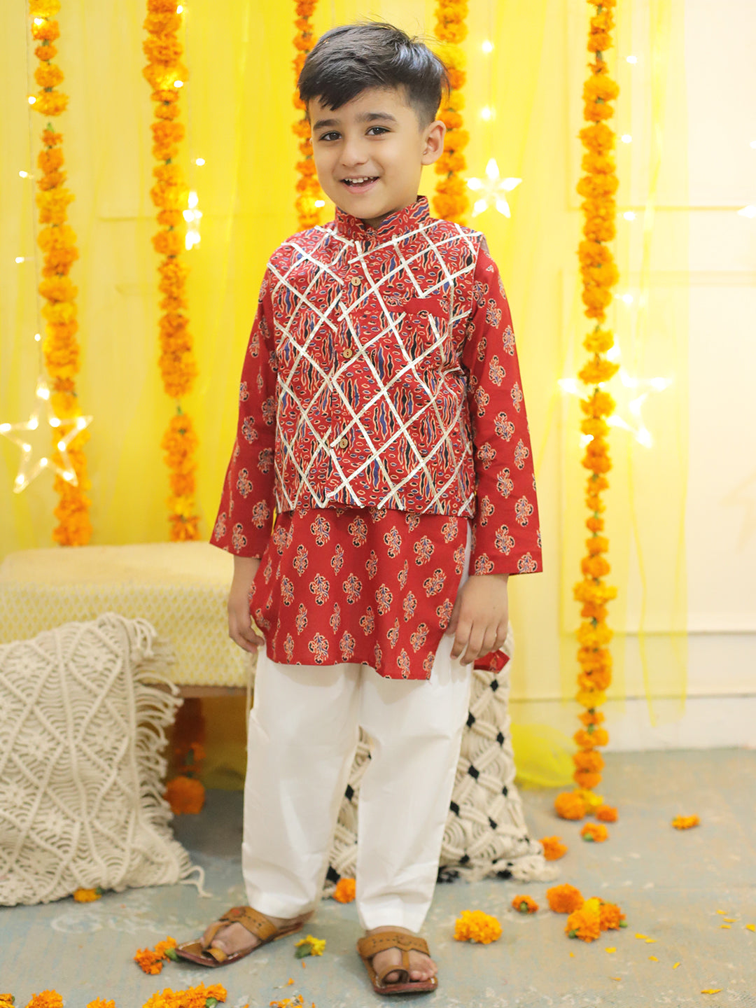 BownBee Boys Pure Cotton Printed Kurta Pajama with Jacket - Red