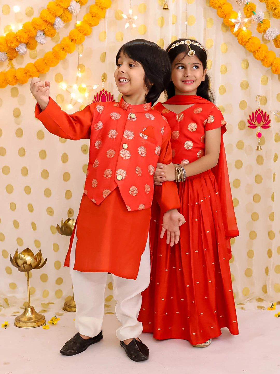 Elevate sibling style with the BownBee Chanderi Lehenga Choli and Kurta Pajama Jacket Set in rich rust. Crafted from premium Chanderi fabric, this ensemble combines traditional elegance with refined comfort. The girls' lehenga choli features intricate detailing for a graceful silhouette, while the boys’ kurta pajama is complemented by a matching jacket, perfectly harmonizing their festive look. Ideal for special occasions, this set celebrates Indian heritage with a modern, sophisticated touch.