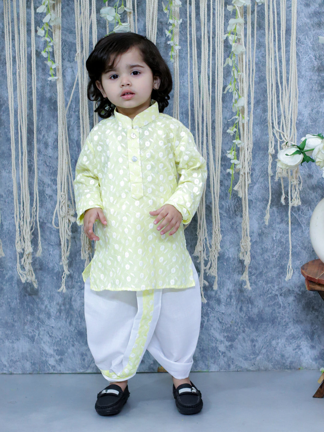 BownBee Chikan Cotton Full Sleeve Kurta with Dhoti for Boys - Yellow
