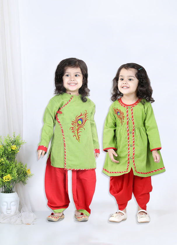 BownBee Cotton Embroidery Dhoti Kurta for Boys-Green Cotton Embroidery Top Dhoti for Girls-Green