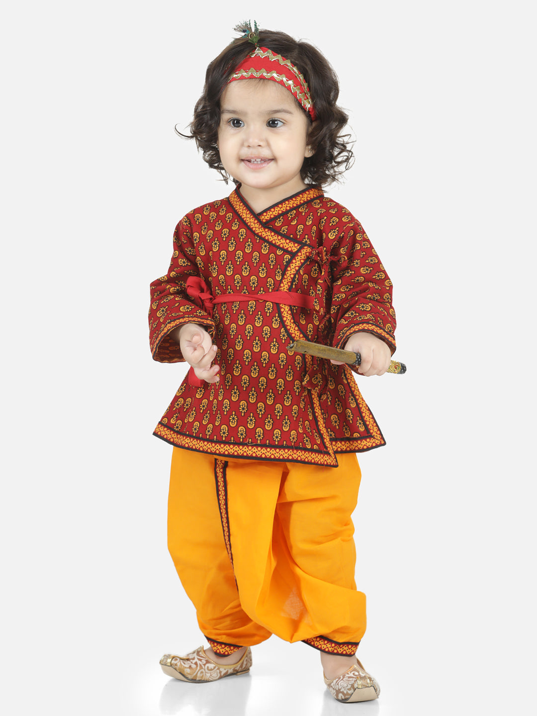 Look your best in the BownBee Cotton Full Sleeves Kanhaiya Hindi Shri Krishna Kurta & Dhoti. The traditional design features a red and yellow palette, crafted from high-quality cotton fabric for optimal comfort and breathability. Perfect for religious ceremonies and festive occasions.