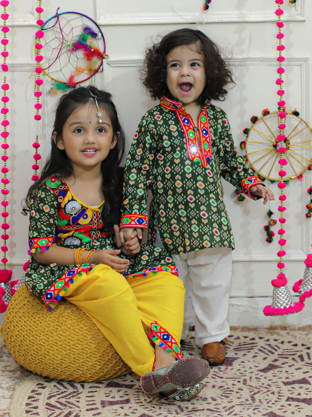 BownBee Embroidered Printed Cotton Kurta with Cotton Pajama- Green with  Embroidered Printed Cotton Top with Cotton Dhoti- Green