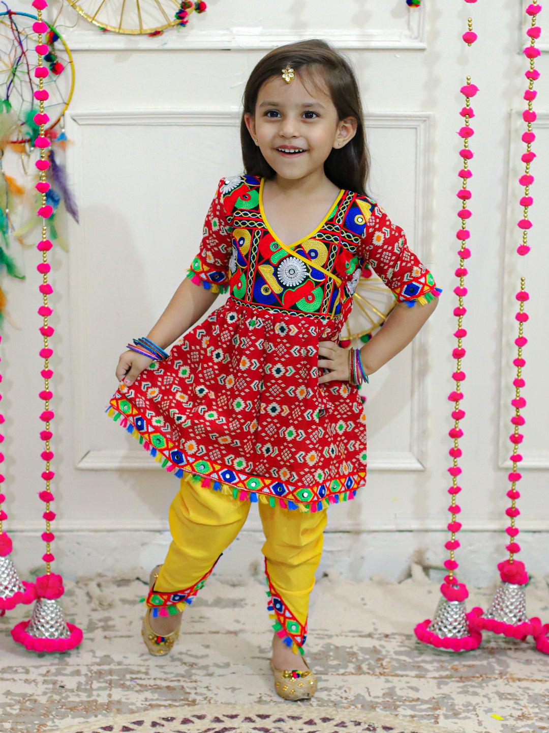 BownBee Kids Girls Navratri Dandiya Garba Embroidered Printed Cotton Top with Cotton Dhoti- Red