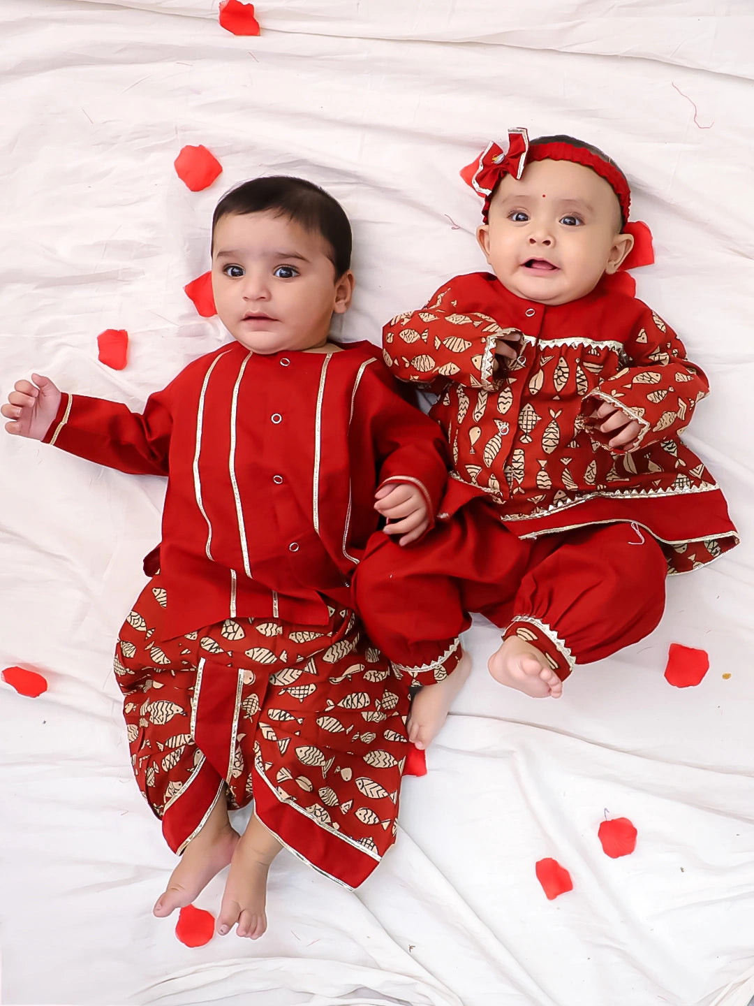 BownBee Festive Suit With Dhoti kurta Sibling Set For Infants - Maroon