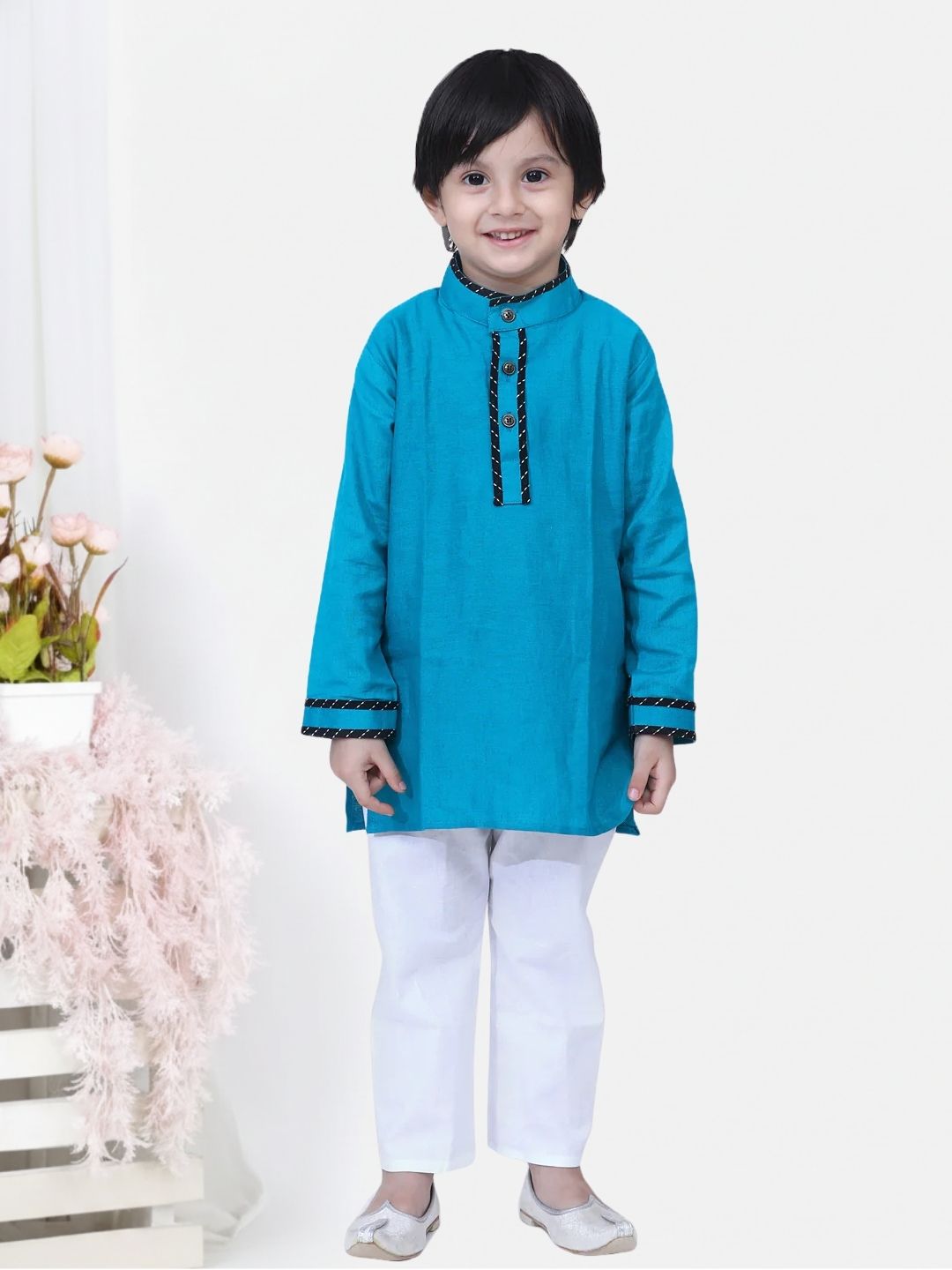 Experience ultimate comfort and style with BownBee's Full Sleeve Stand Collar Kurta Pajama. Crafted with fine cotton fabric, it provides maximum breathability and flexibility that stands the test of time. With a trendy teal colour and an elegant stand collar, it's sure to make heads turn.