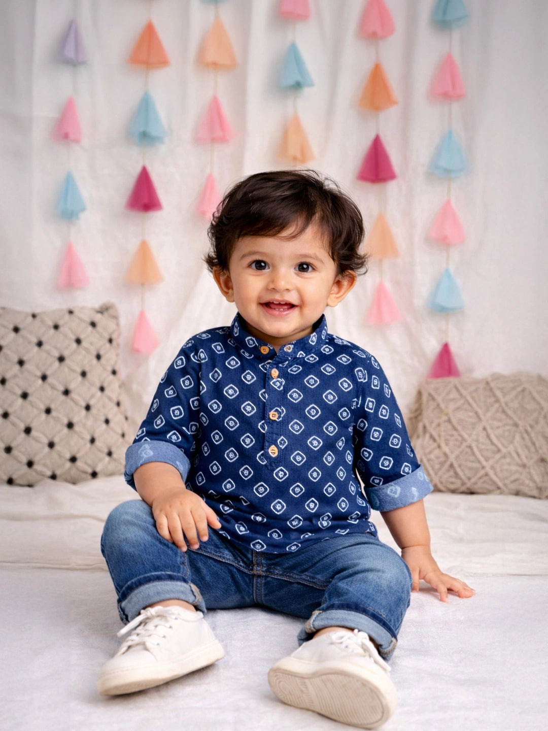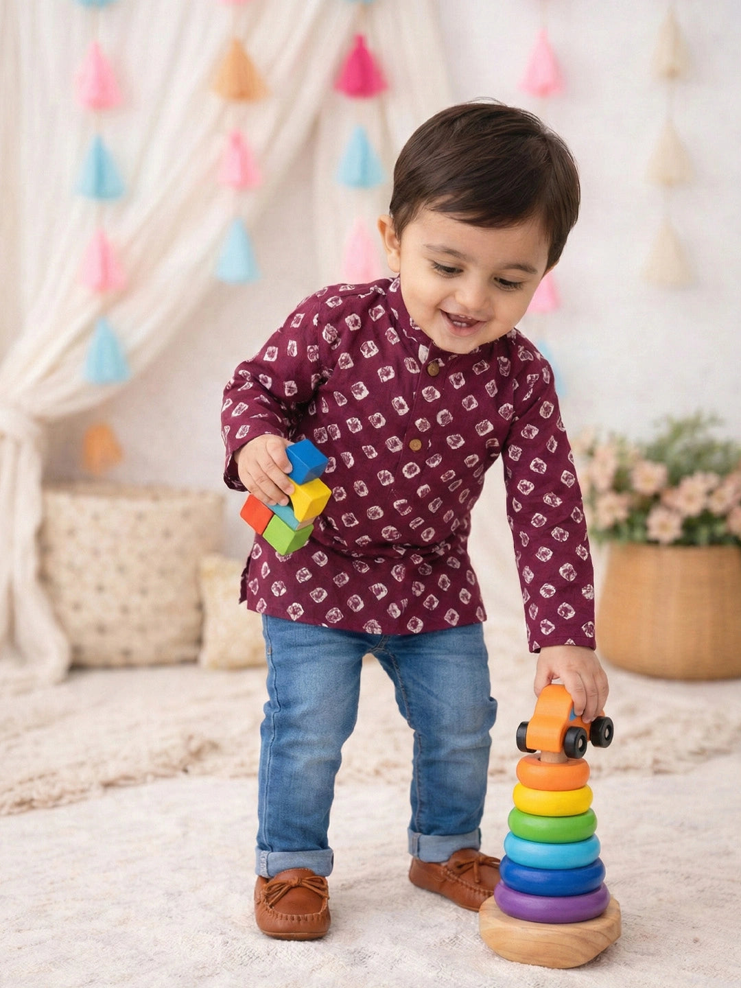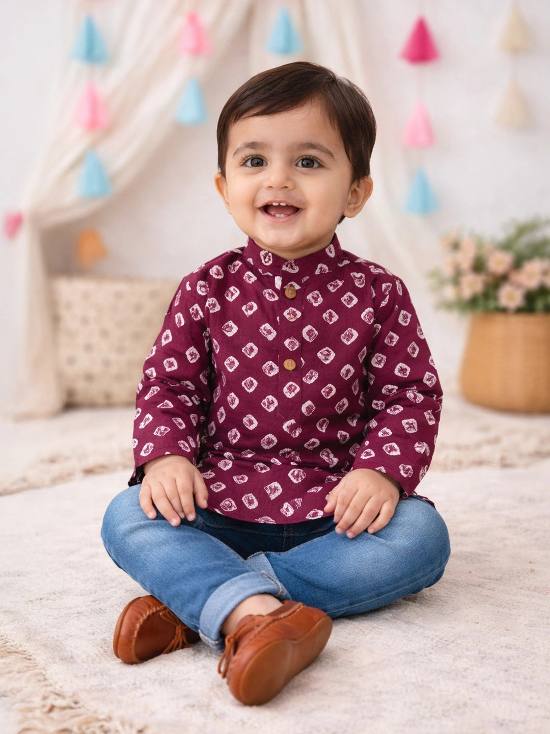 Introduce your little one to timeless Indian elegance with this exquisite full-sleeve bandhni short kurta. Crafted with meticulous tie-dye artistry, each piece showcases the traditional bandhni pattern in a refined purple hue. The full sleeves provide gentle coverage while maintaining comfort for active infants, making it ideal for festive occasions, family gatherings, or everyday celebrations. Soft, breathable fabric ensures your child stays comfortable throughout the day. A sophisticated choice that honors cultural heritage while keeping your infant stylishly dressed.