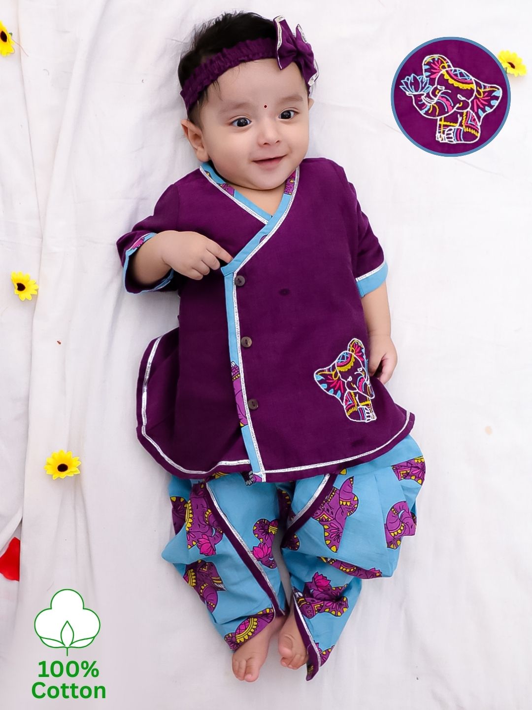 Crafted from pure cotton, this sleeveless Angarakha-style kurti features delicate embroidery and a charming elephant print, offering both comfort and elegance for infant girls. Paired with a coordinating dhoti, this ensemble combines traditional Indian design with breathable fabric, ensuring your little one stays cool and stylish during warm days. Perfect for festive occasions or casual wear, it brings a refined touch to children's wardrobe essentials.