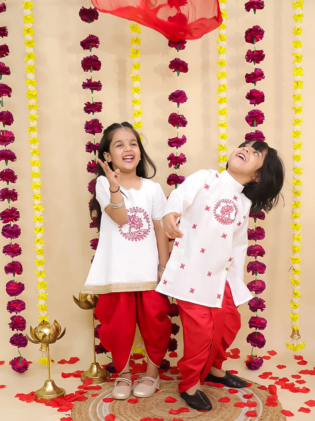 BownBee Lotus Embroidered Suit & Dhoti Kurta Sibling Set - White