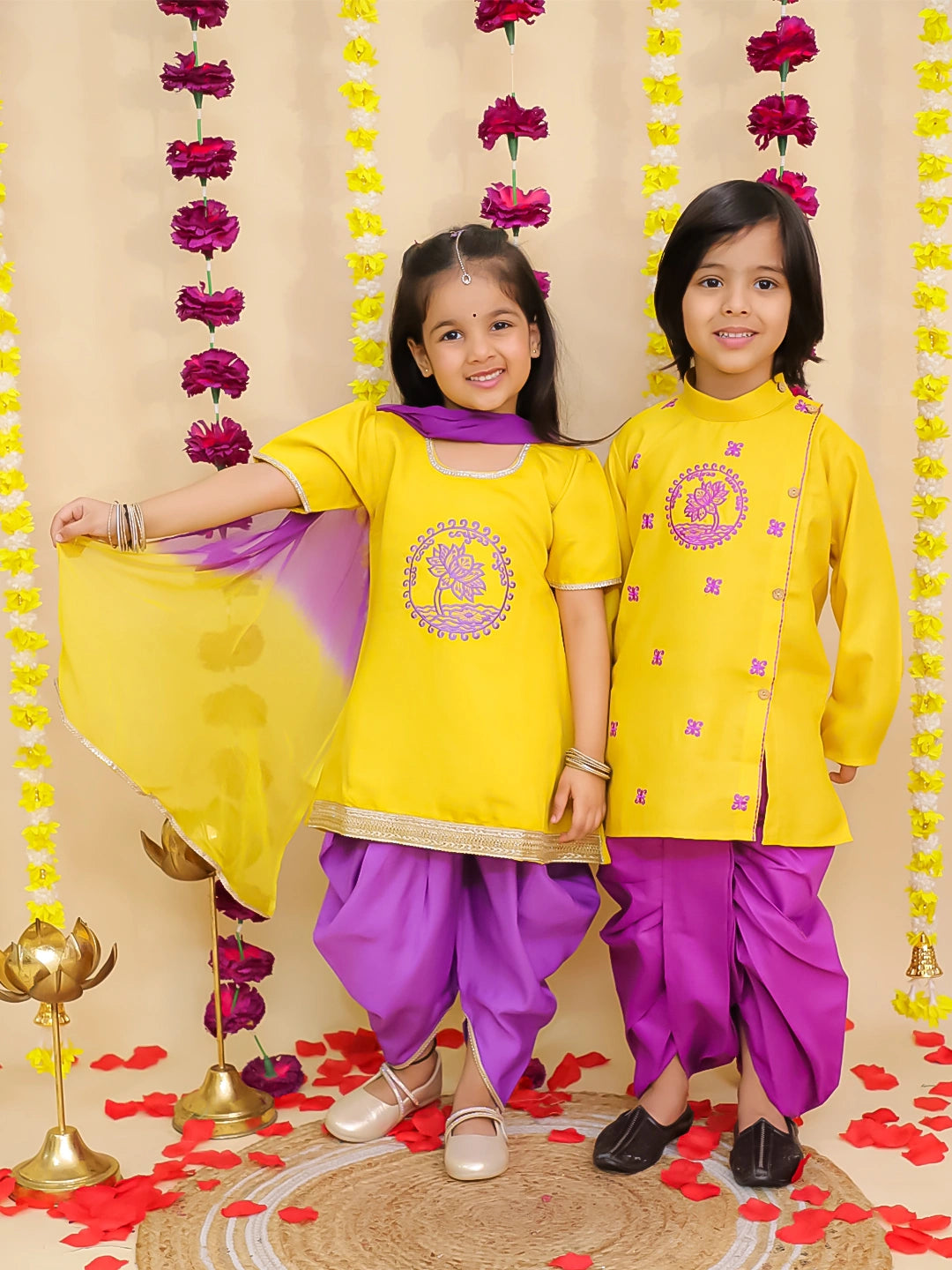 BownBee Lotus Embroidered Suit & Dhoti Kurta Sibling Set - Yellow