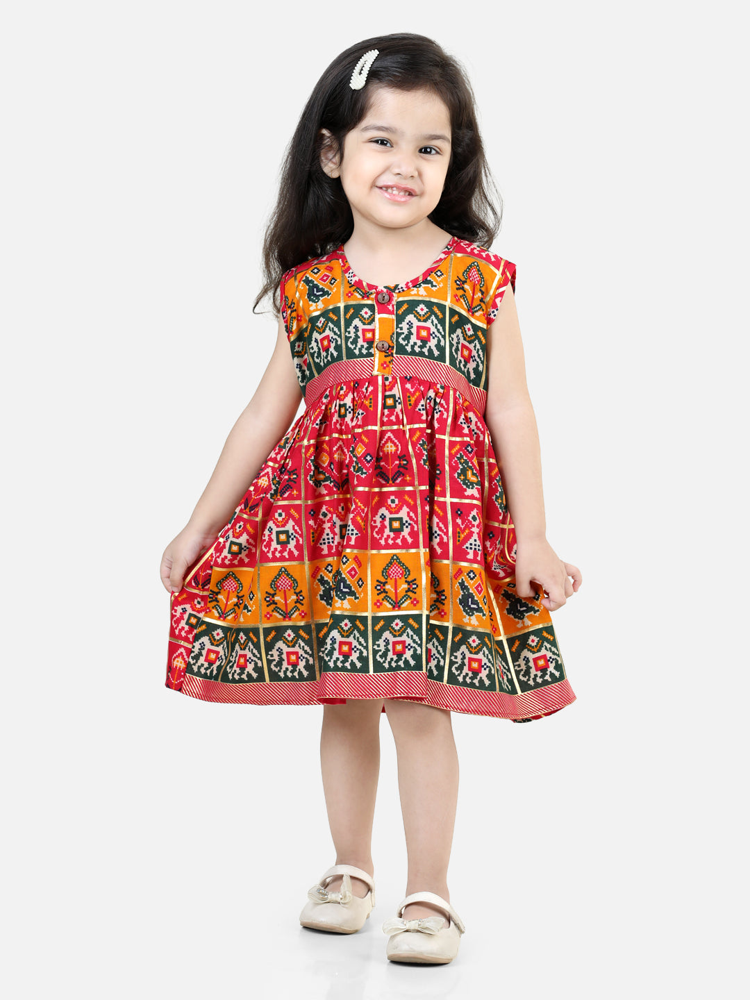 BownBee Patan Patola Printed Sleeveless Rayon Frock- Pink
