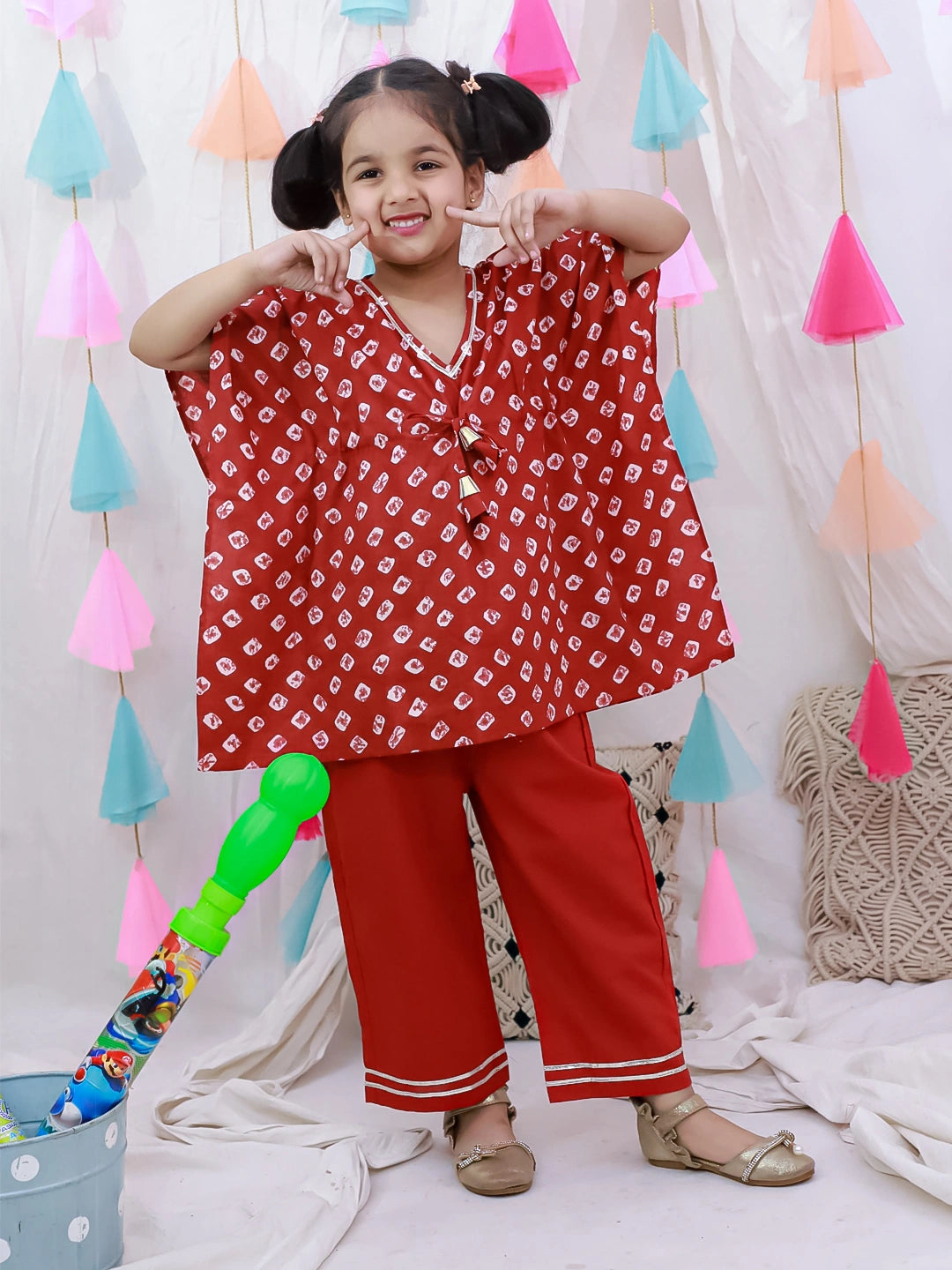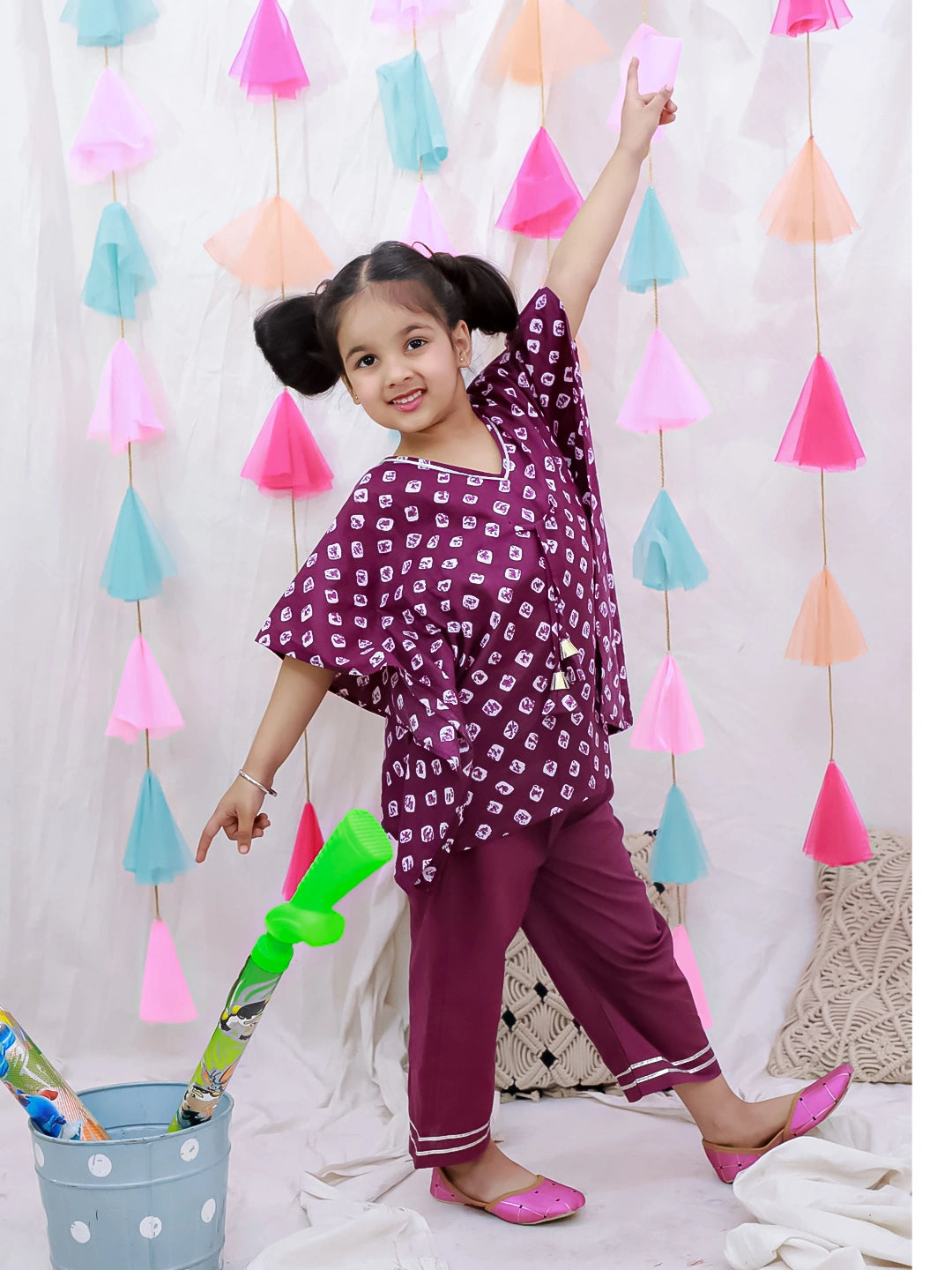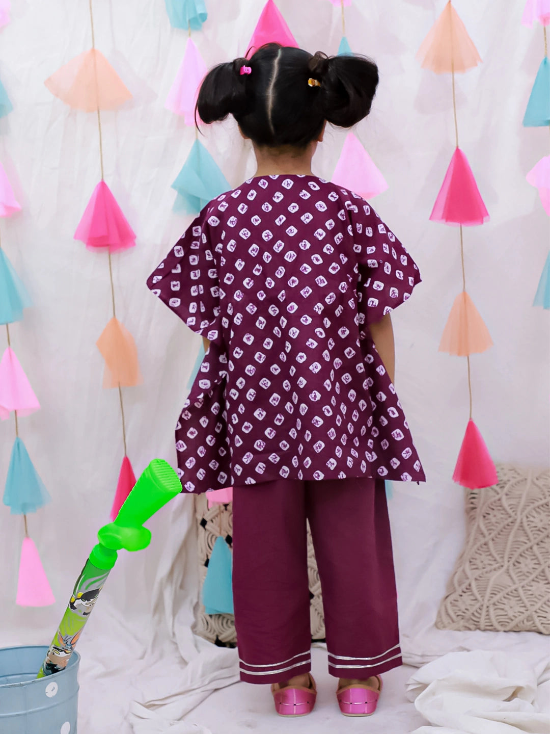 Introduce your daughter to timeless elegance with this exquisite Badhani Kaftan & Plazao set. Crafted from pure cotton, this traditional ensemble combines comfort with refined style, featuring the intricate Badhani print that celebrates Indian heritage. The flowing kaftan paired with coordinating plazao creates a graceful silhouette perfect for festive occasions, family gatherings, or everyday wear. The breathable fabric ensures all-day comfort in warm weather, while the sophisticated purple hue adds a touch of regal charm. An ideal choice for parents seeking authentic, quality clothing that honors cultural traditions while keeping their child comfortable and stylish.