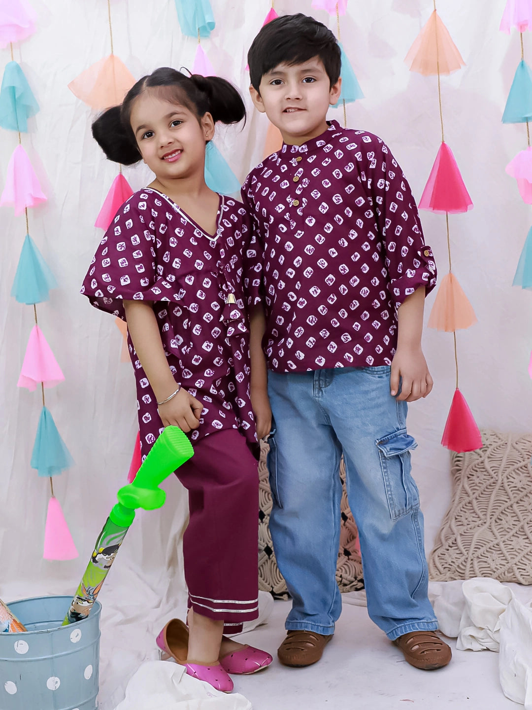 Celebrate sibling style with this exquisite Bandhani set, where traditional craftsmanship meets contemporary comfort. Featuring vibrant purple tie-dye patterns on pure cotton, this collection offers a short kurta for one child and a flowing kaftan for another, each paired with coordinating palazzo pants. The breathable fabric ensures all-day comfort in warm weather, while the timeless Bandhani technique adds authentic Indian artistry. Perfect for festivals, family gatherings, or everyday elegance, this coordinated set lets siblings shine together in coordinated sophistication.