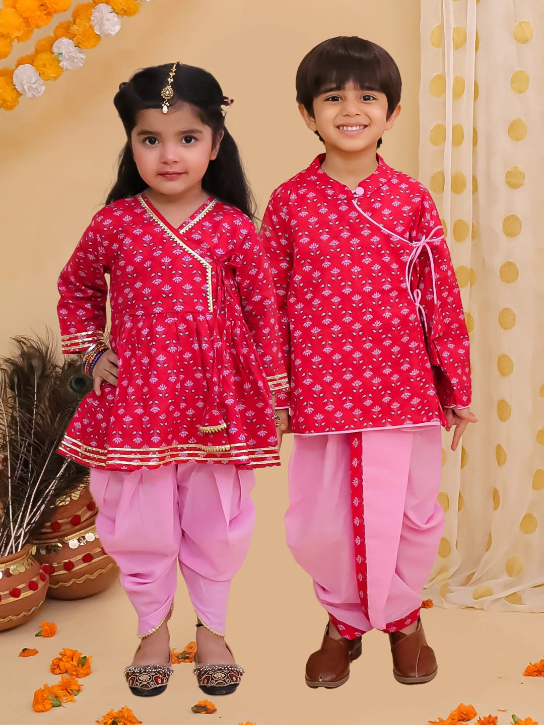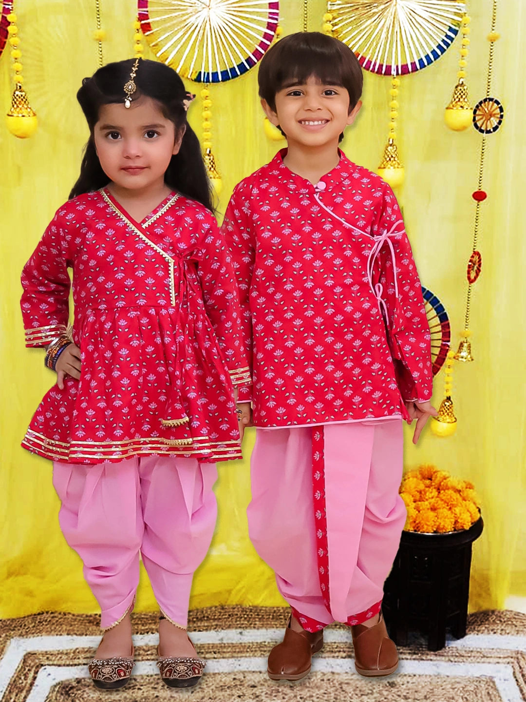 BownBee Pure Cotton Bandhni Kurti Dhoti & Dhoti Kurta Sibling Set - Red