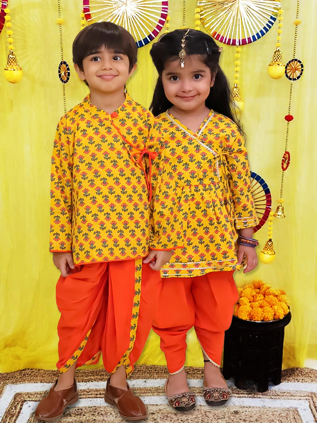BownBee Pure Cotton Bandhni Kurti Dhoti & Dhoti Kurta Sibling Set - Yellow