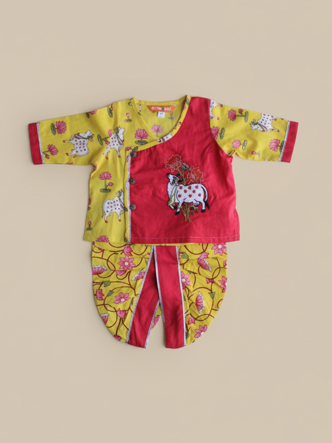 This refined set features a pure cotton kurta and dhoti adorned with delicate embroidery, crafted for infant boys. The soft, breathable fabric ensures comfort for sensitive skin, while the intricate embroidery adds an elegant detail that elevates traditional attire. Presented in a gentle pink hue, this ensemble blends sophistication with cultural heritage, ideal for memorable occasions.