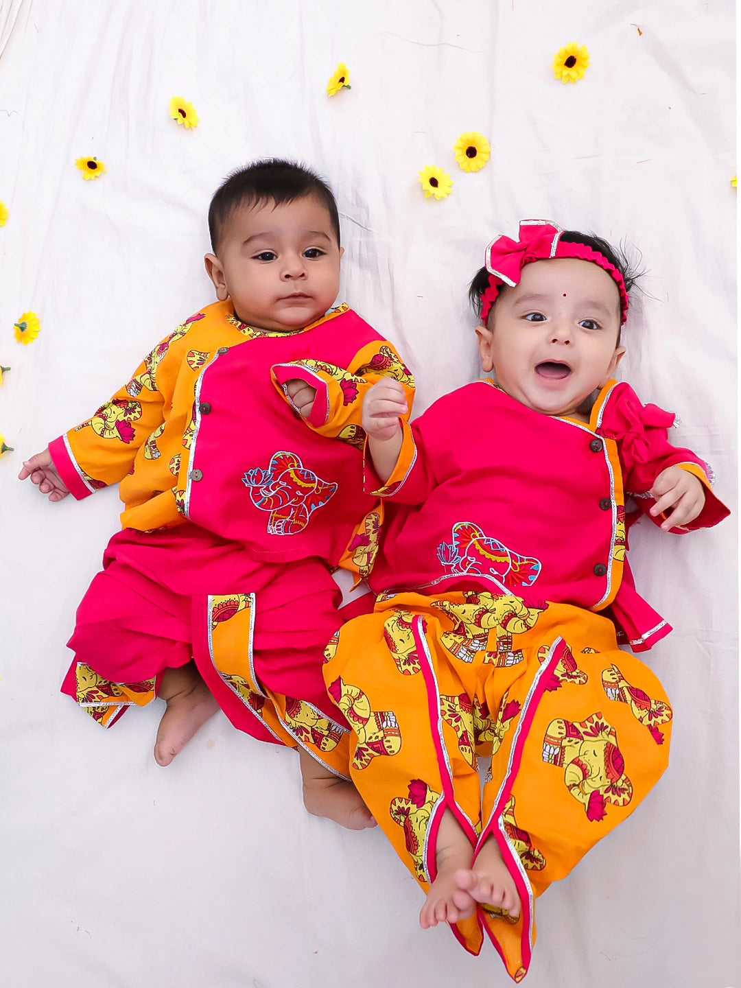 BownBee Pure Cotton Fish Embroidered Ethnic Suit Set & Kurta Dhoti Sibling Set For Infants - Pink