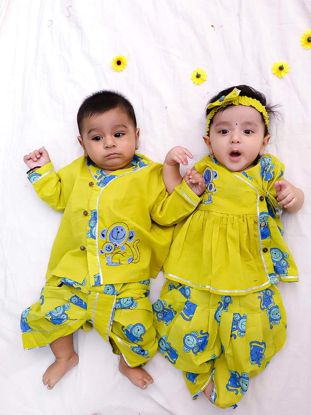 BownBee Pure Cotton Fish Embroidered Ethnic Suit Set & Kurta Dhoti Sibling Set For Infants - Yellow