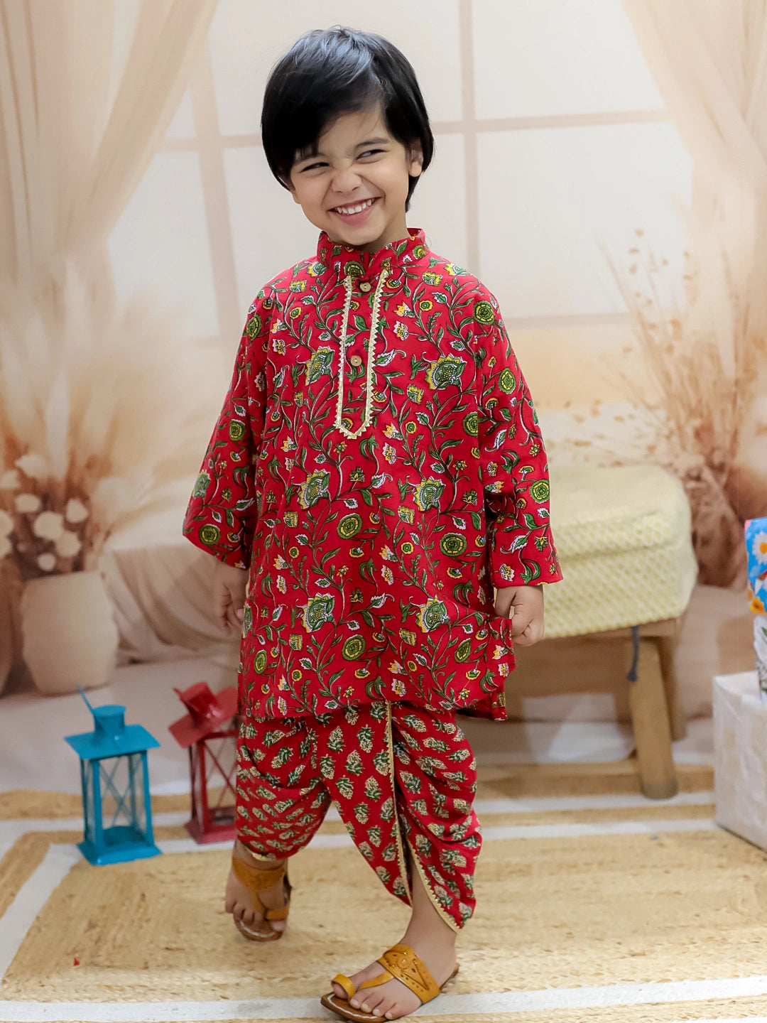 BownBee Pure Cotton Full Sleeve Printed Kurta Dhoti for Boys- Red