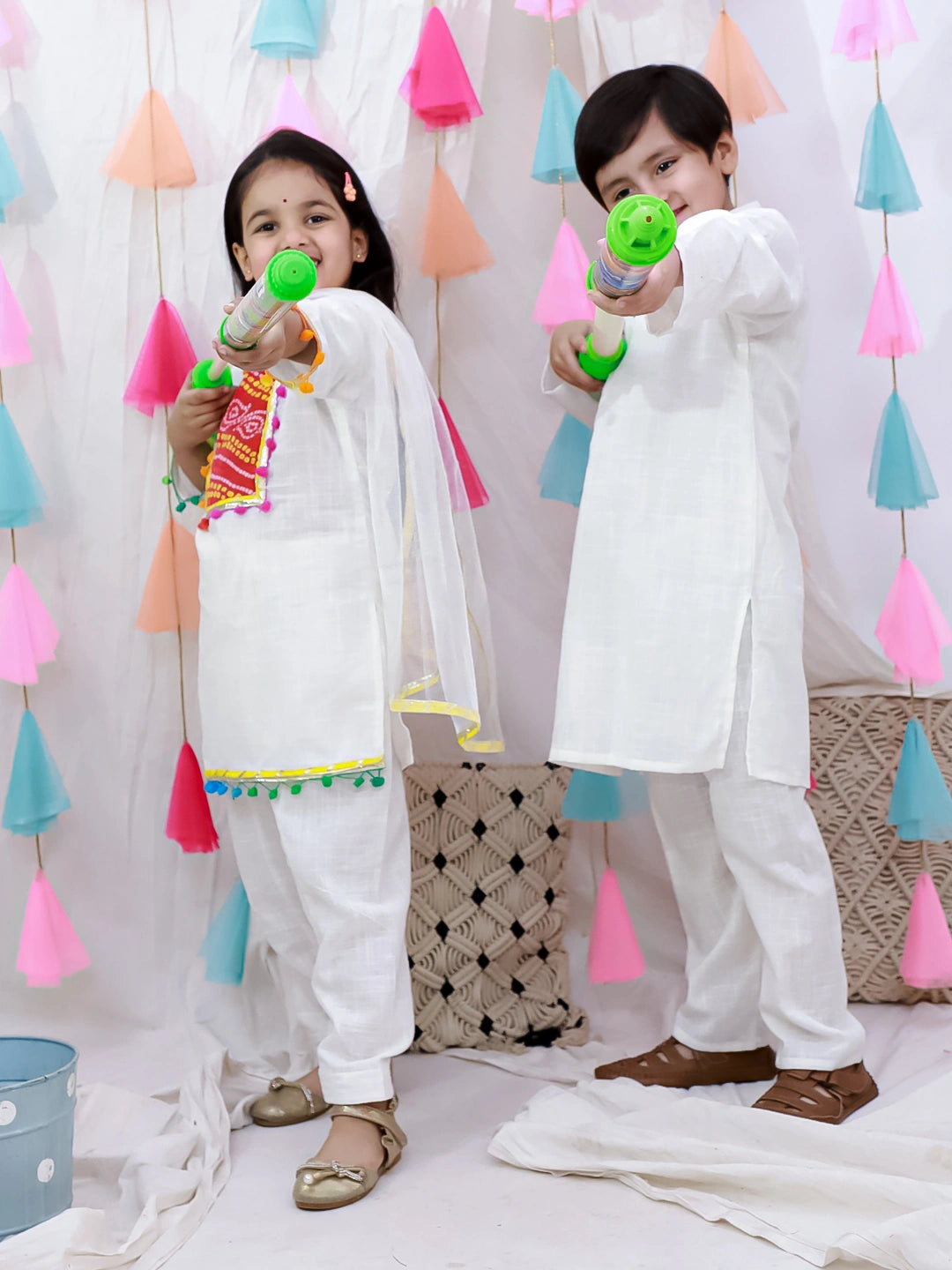 Introduce your little ones to timeless elegance with this exquisite sibling set from BownBee. Crafted from pure cotton, this coordinated ensemble features traditional kurta pajamas paired with an ethnic suit, complete with a graceful dupatta. The white palette offers versatility for festivals, celebrations, and special occasions while ensuring comfort throughout the day. Perfect for matching moments that celebrate your children's bond, this set combines authentic Indian craftsmanship with contemporary styling. Ideal for creating cherished memories in coordinated traditional wear.
