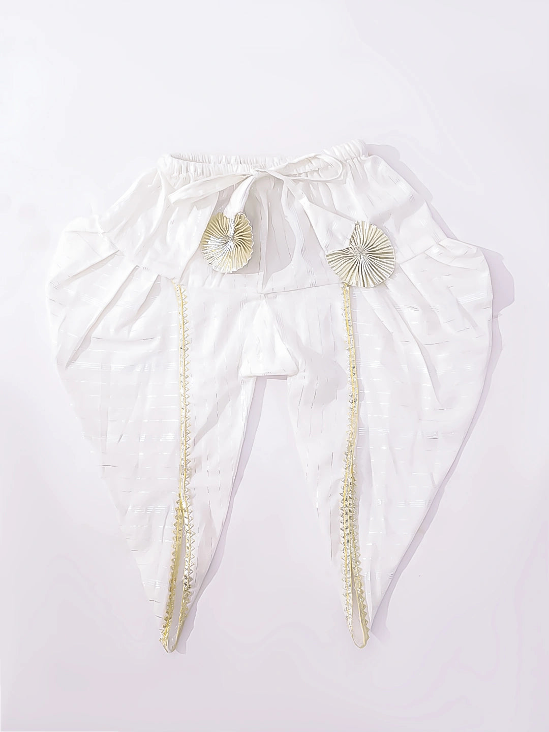 Crafted from pure cotton with delicate lurex detailing, this white kurti and dhoti set offers refined comfort for infant girls. The breathable fabric ensures gentle wear on sensitive skin, while the elegant design adds a touch of traditional charm perfect for special occasions. A sophisticated choice that combines style and softness with ease.