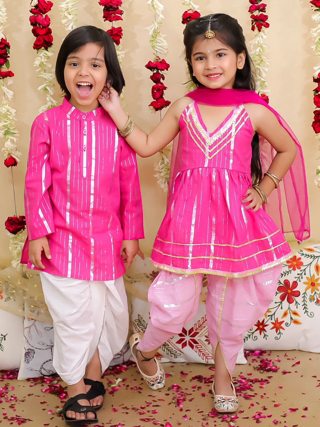 Designed for brothers and sisters to shine together. This beautiful sibling collection is perfect for Rakhi celebrations, weddings, family functions, and festivals like Diwali, Navratri, Janmashtami, Eid, and more. Crafted from soft cotton with elegant lurex detailing, the set features a festive dhoti kurta for boys and a graceful traditional suit for girls, offering both comfort and charm. Whether you’re looking for ethnic wear for kids, a Rakhi gift, or stylish kids festive clothing, this set is a thoughtful and picture-perfect choice. Ideal as a wedding gift for siblings or for creating lasting memories during special occasions, this Indian dress for kids comes in multiple s and is perfect for toddlers and young children. Add cultural elegance to your child’s wardrobe with this adorable toddler ethnic set that celebrates tradition and togetherness.