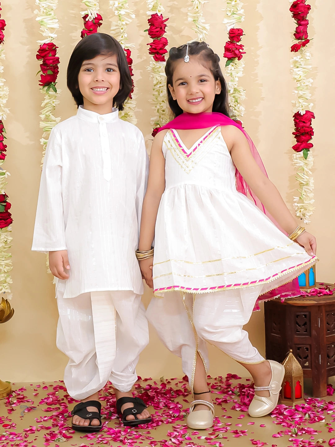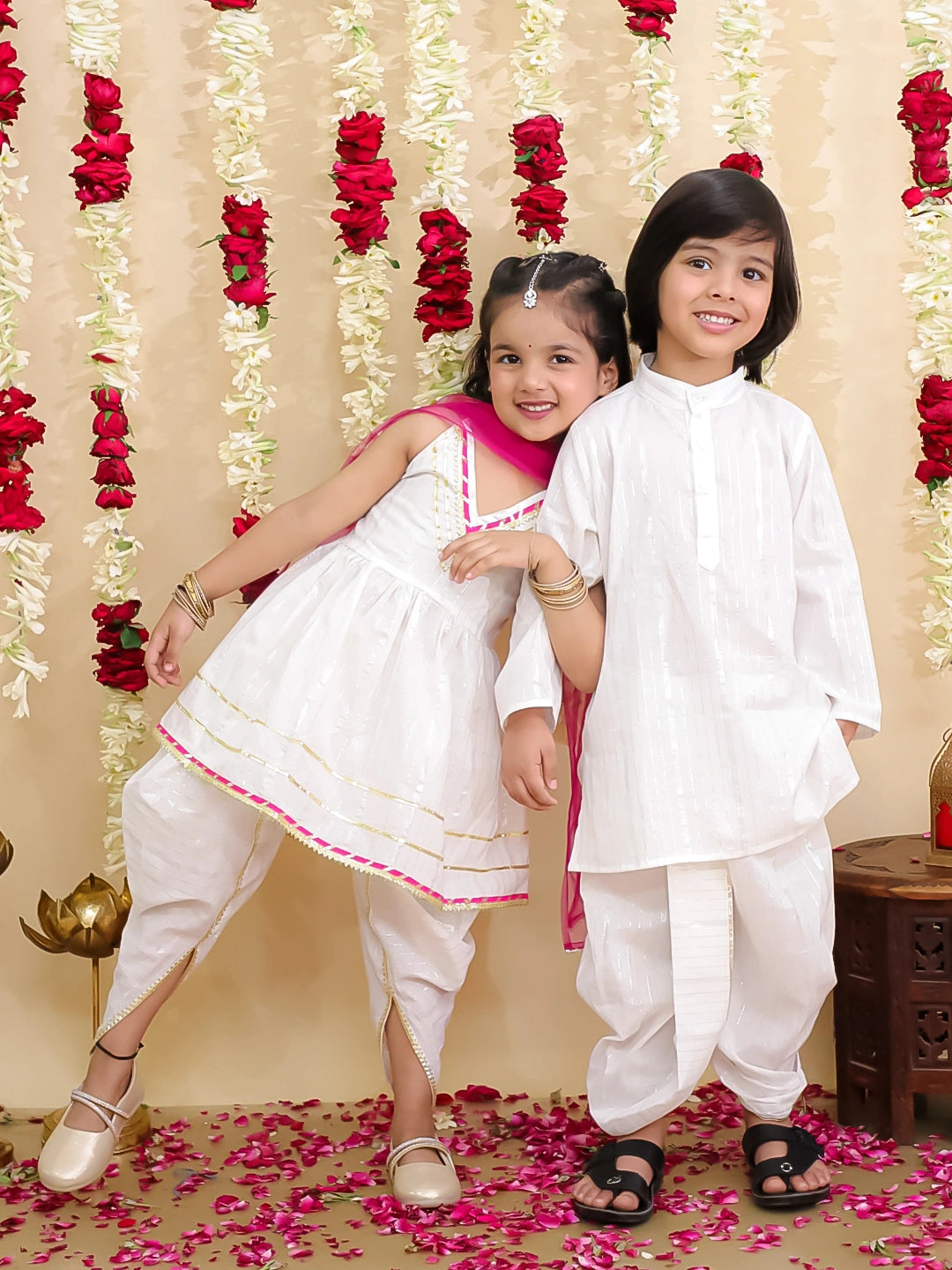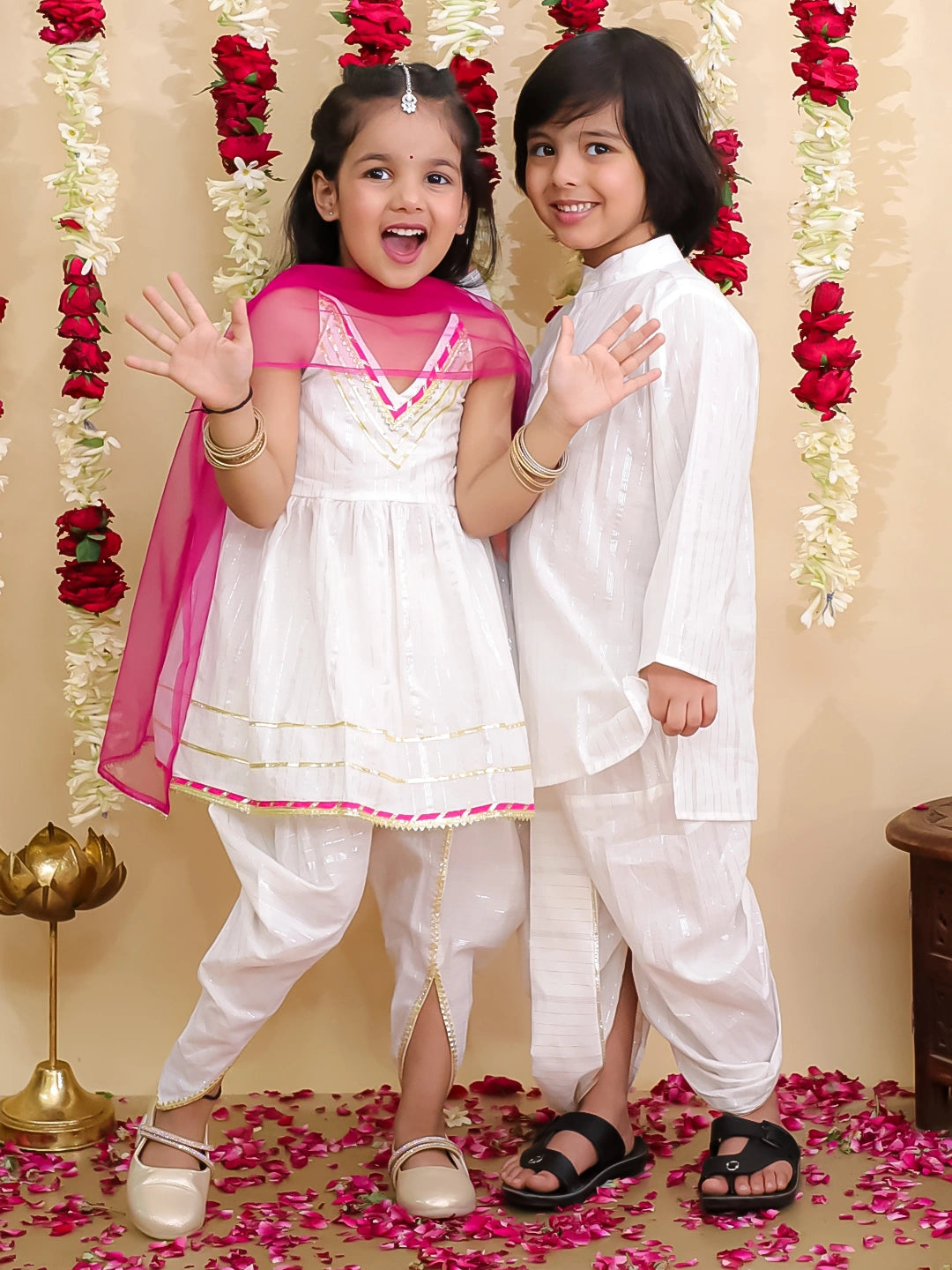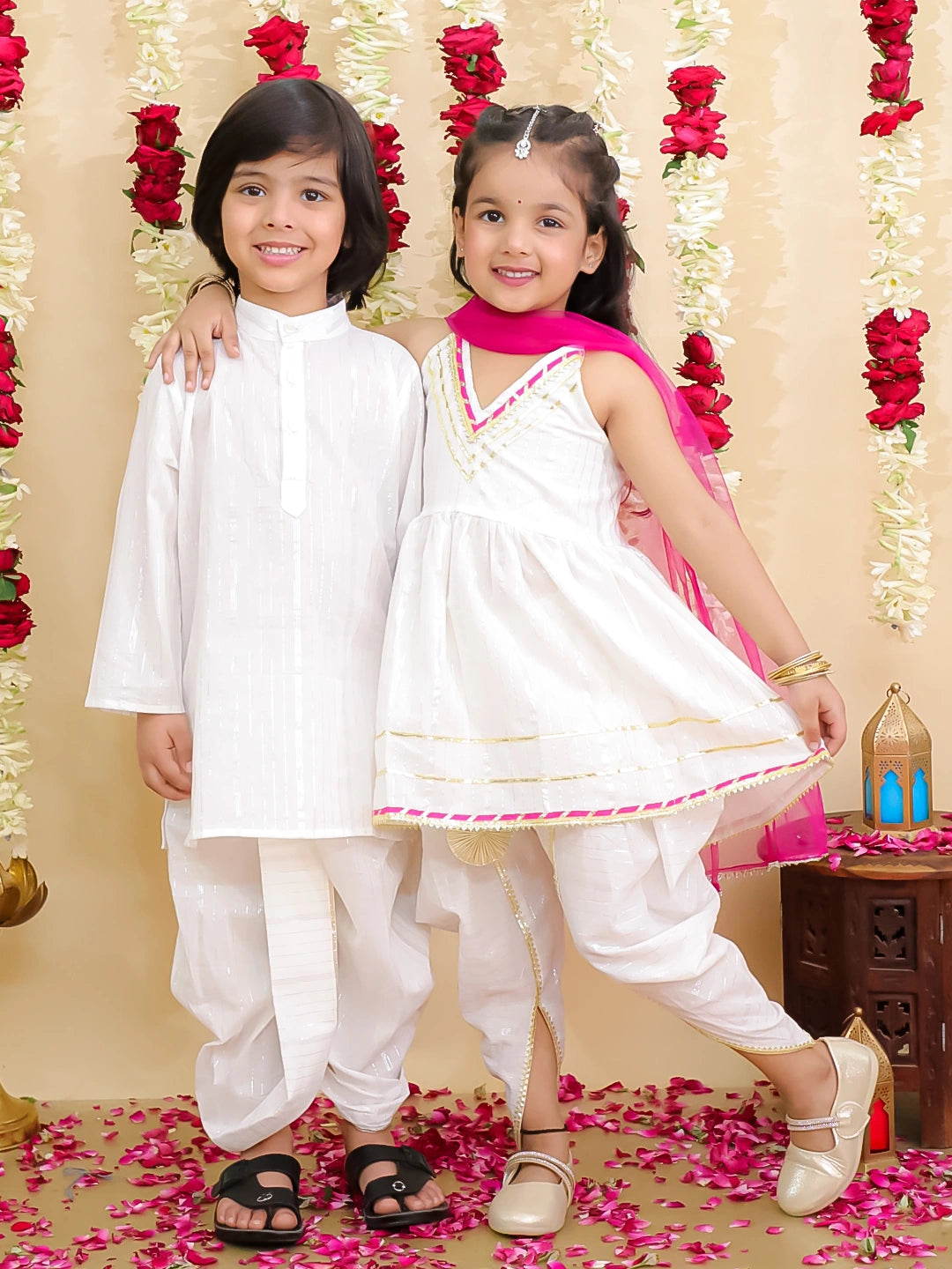 Celebrate special moments in style with the BownBee Pure Cotton Lurex Suit & Dhoti Kurta Sibling Set in elegant white. Thoughtfully designed for both boys and girls, this traditional outfit for kids features a soft cotton fabric with subtle lurex detailing, offering a festive look with all-day comfort. The set includes a charming kurta and dhoti for boys and a beautiful ethnic suit for girls, making it a perfect toddler ethnic set for family functions, weddings, and festivals like Raksha Bandhan or Diwali. This coordinated ethnic wear for girls and boys adds a touch of tradition and bonding for siblings, while being easy to wear and gentle on the skin. If you’re looking for kids festive clothing or a stylish Indian dress for kids, this sibling set is a must-have. Available in multiple s for a picture-perfect festive look.