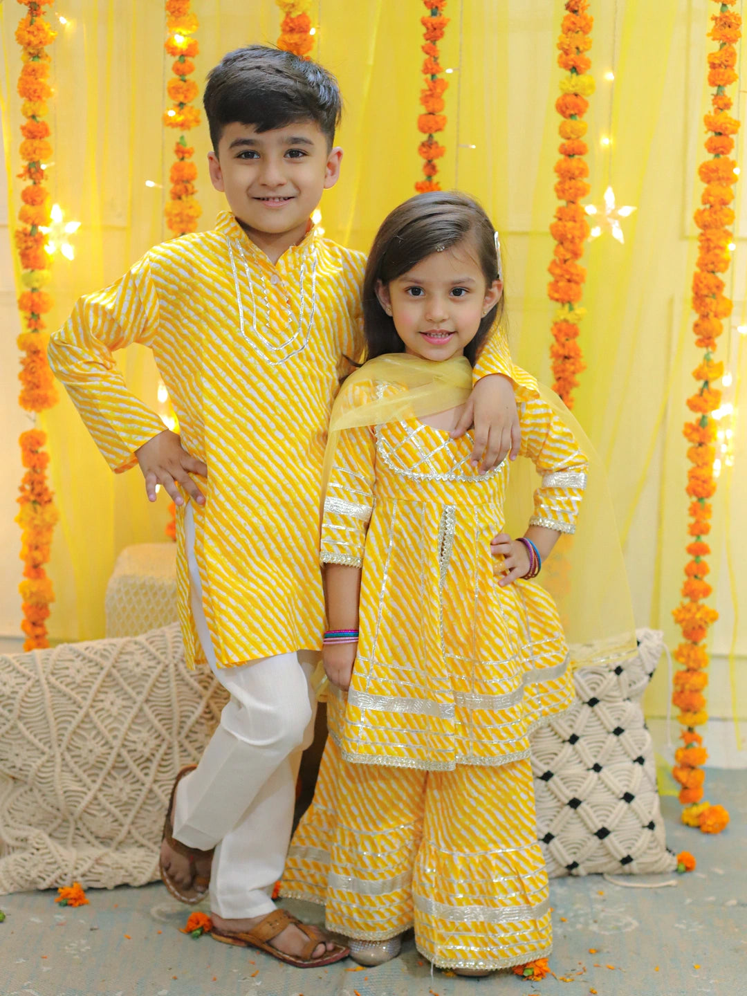 This top-quality BownBee set combines a Pure Cotton Printed Leheriya Kurta Pajama for Boys- Yellow with a Pure Cotton Printed Kurta Sharara with Dupatta for Girls- Yellow. The premium cotton fabric provides enhanced breathability and superior comfort for all-day wear. The subtle prints adds a subtle flair to the garment. Perfect for a special occasion!