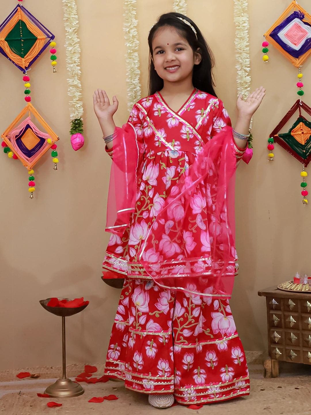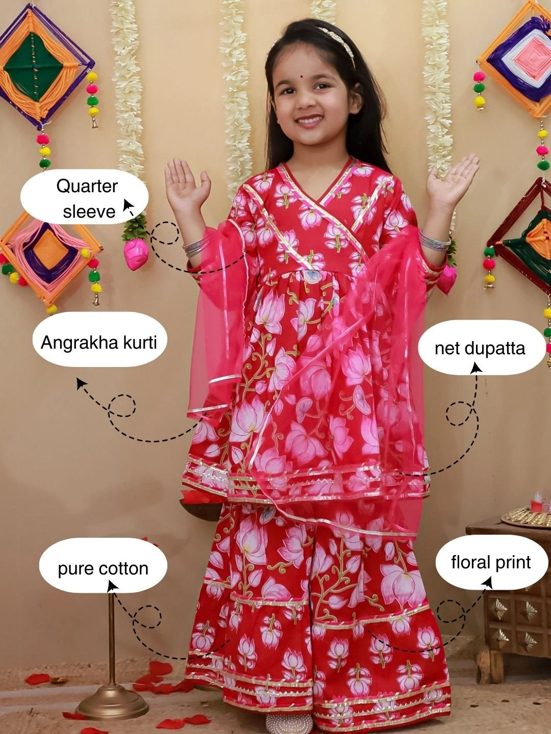 Celebrate your daughter's special moments in this elegant pure cotton Anarkali kurti set. Featuring traditional angarakha-style quarter sleeves and vibrant printed patterns, this ensemble combines classic Indian aesthetics with comfortable everyday wear. The set includes a beautifully tailored kurti, matching sharara pants, and a flowing dupatta, perfect for festivals, celebrations, or family gatherings. Crafted from breathable pure cotton, it ensures all-day comfort while maintaining the graceful silhouette of authentic ethnic wear. An ideal choice for girls who love traditional fashion with a contemporary twist.