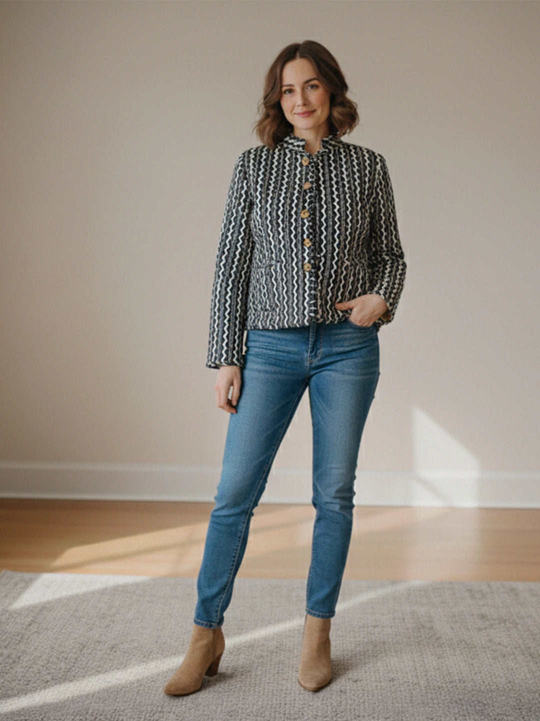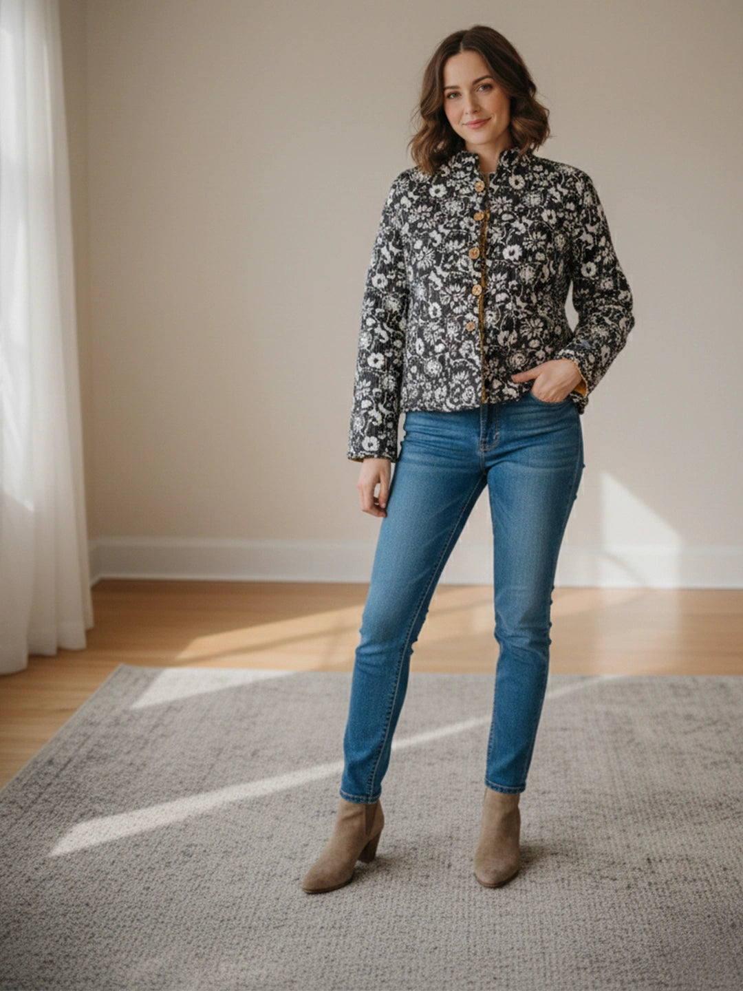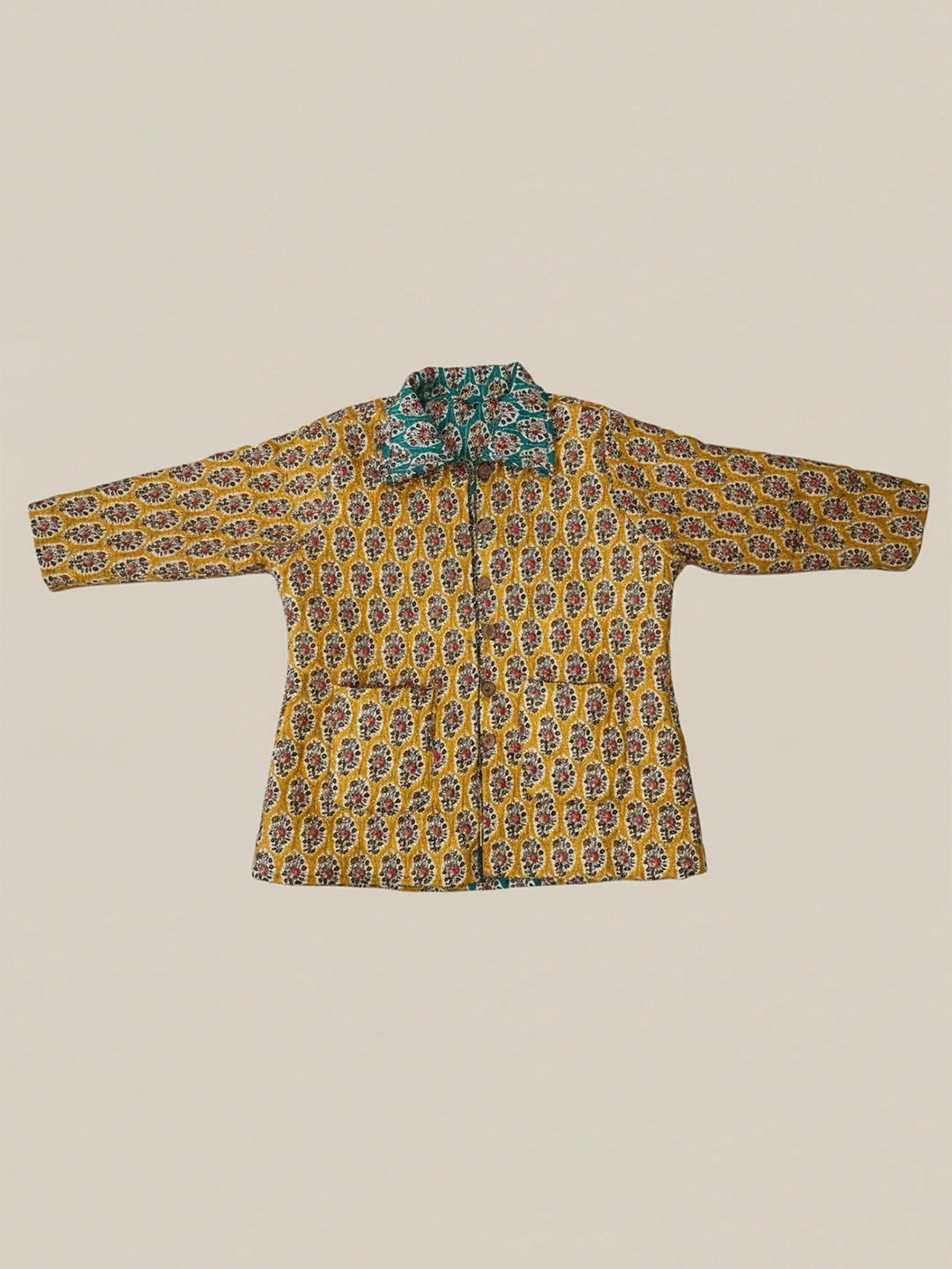 Embrace effortless elegance with this versatile quilted jacket, crafted from pure cotton for breathable comfort throughout the day. The striking printed design adds a contemporary touch, while the reversible construction offers two distinct looks in one piece. Perfect for layering during cooler months, this yellow jacket transitions seamlessly from casual outings to relaxed social gatherings. The quilted texture provides gentle warmth without bulk, making it an essential addition to any woman's wardrobe. Thoughtfully designed for the modern Indian woman who values both style and practicality.