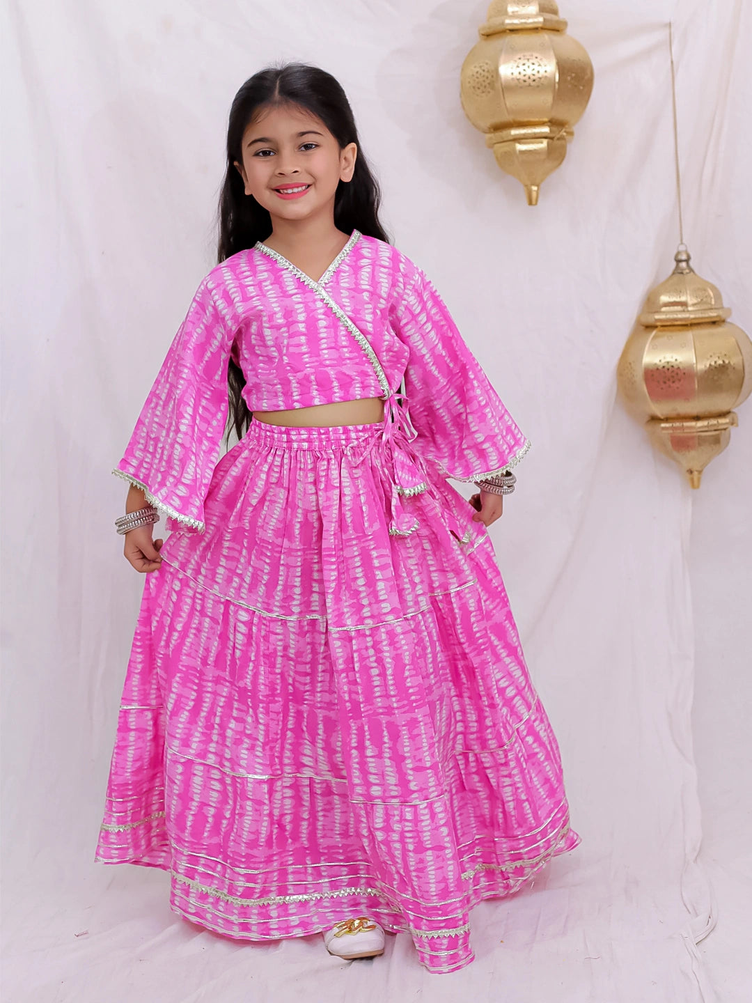 BownBee Pure Cotton Quater Sleeves Tie & Dye Top With Skirt For Girls - Pink