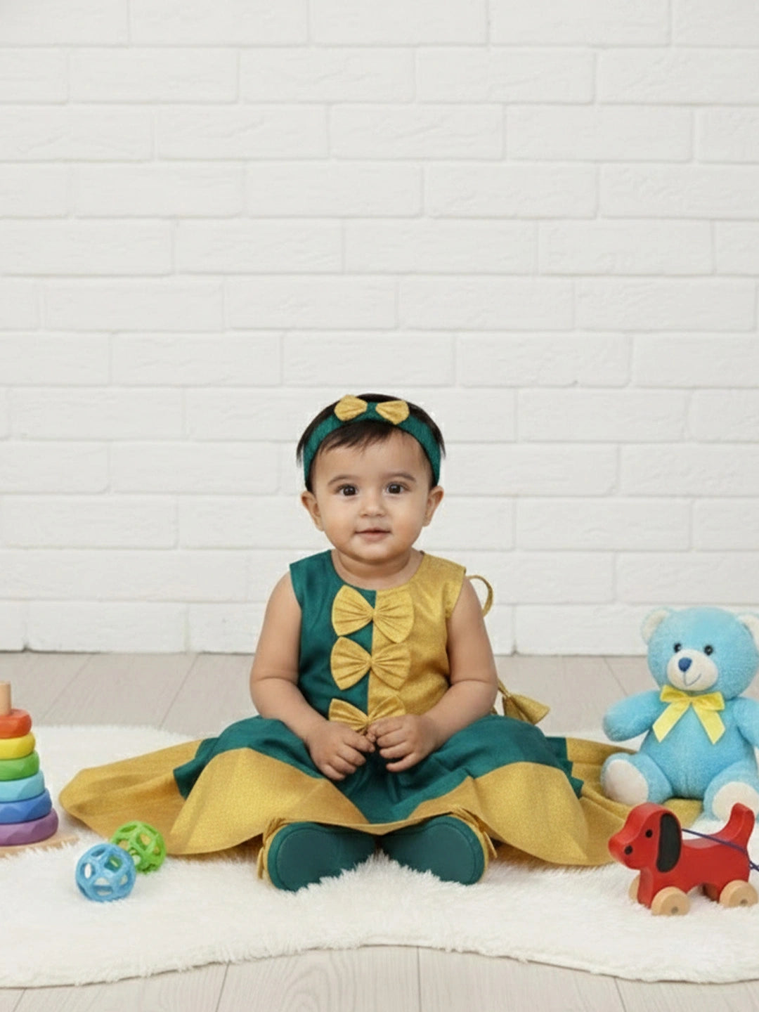 BownBee Sleeveless Chanderi Lehenga Choli With Hairband & Botties Set For Infant Girls- Green
