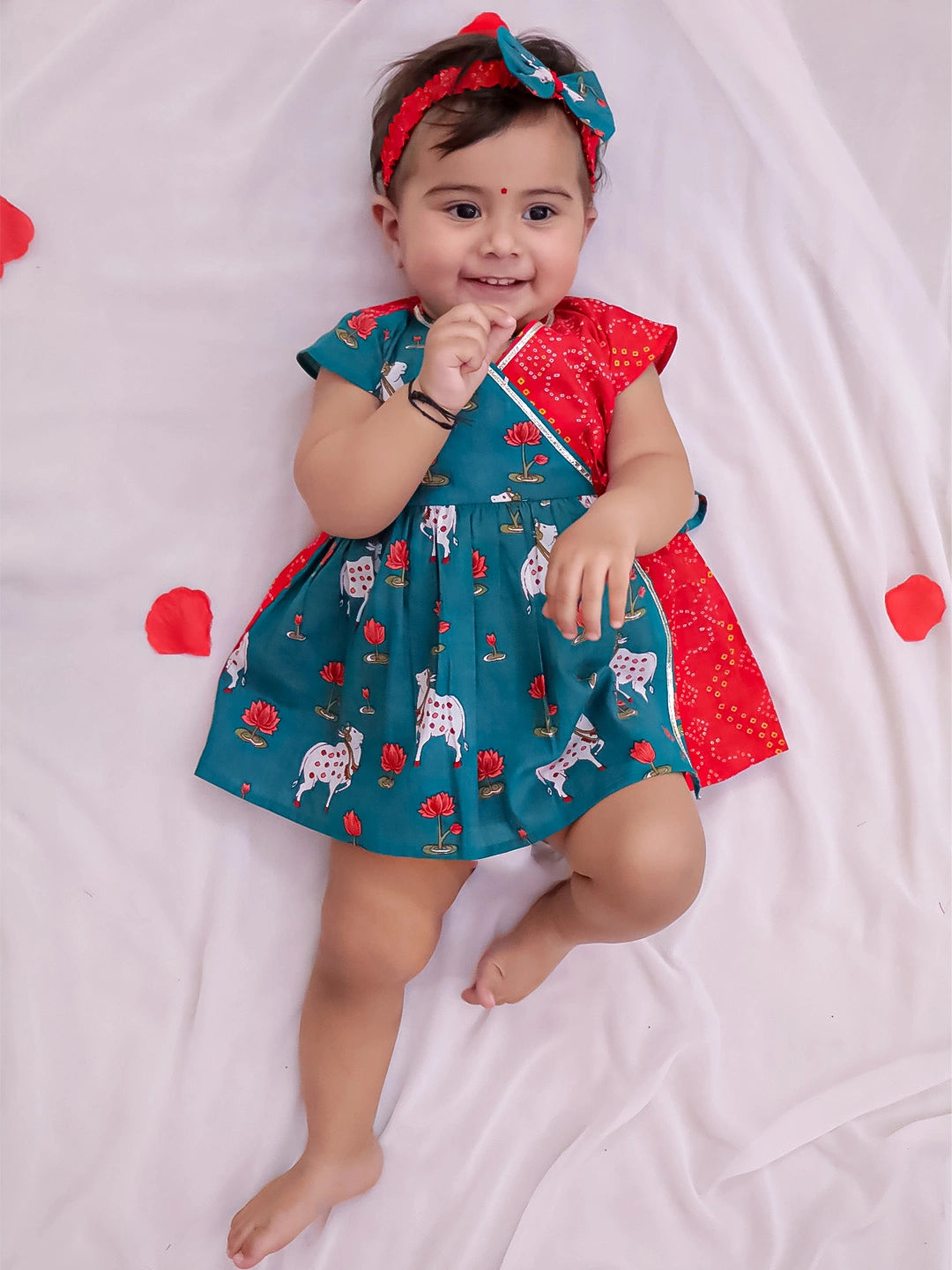 Introduce your little one to timeless elegance with this pure cotton ruffle sleeve dress, thoughtfully designed for infants. Crafted from breathable, soft cotton fabric, it ensures comfort throughout the day while the charming ruffle detailing adds a touch of refined sophistication. The coordinating hairband completes the ensemble, making it perfect for special occasions or everyday wear. Gentle on delicate skin and easy to care for, this red dress celebrates classic style with a modern sensibility.