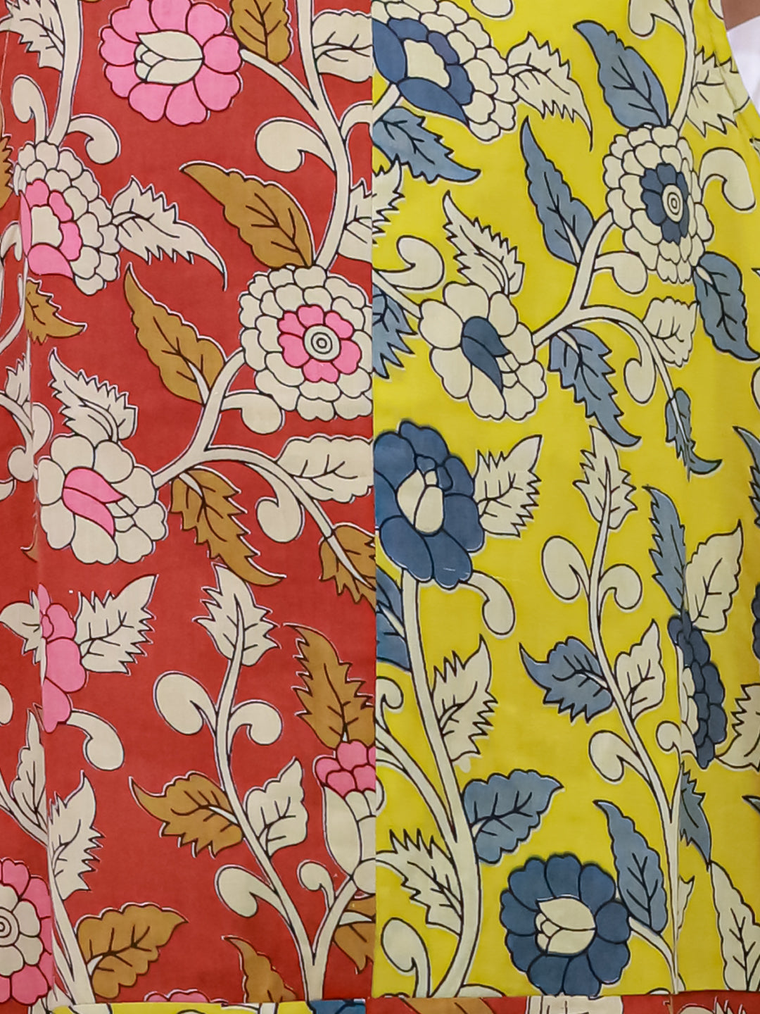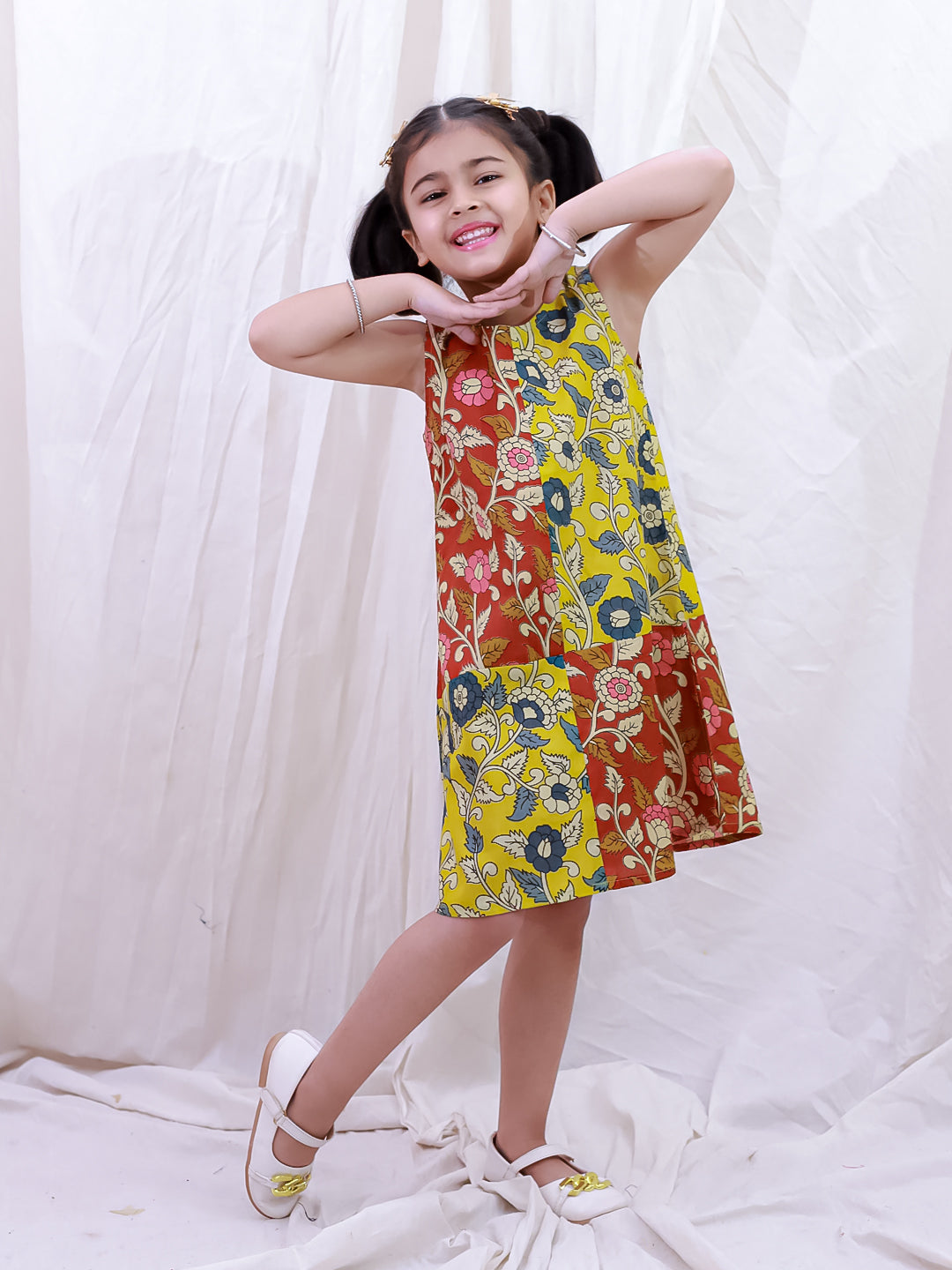 Introduce your daughter to timeless elegance with this sophisticated summer dress, crafted from pure cotton for breathable comfort during warm days. The sleeveless design offers freedom of movement, while the striking Kalamkari print—a traditional Indian art form—adds cultural richness and artistic flair. The color-block pattern in mustard creates a modern aesthetic that effortlessly blends heritage with contemporary style. Perfect for casual outings, family gatherings, or festive occasions, this dress celebrates Indian craftsmanship while keeping your child cool and stylish. A versatile wardrobe essential that grows with her confidence.