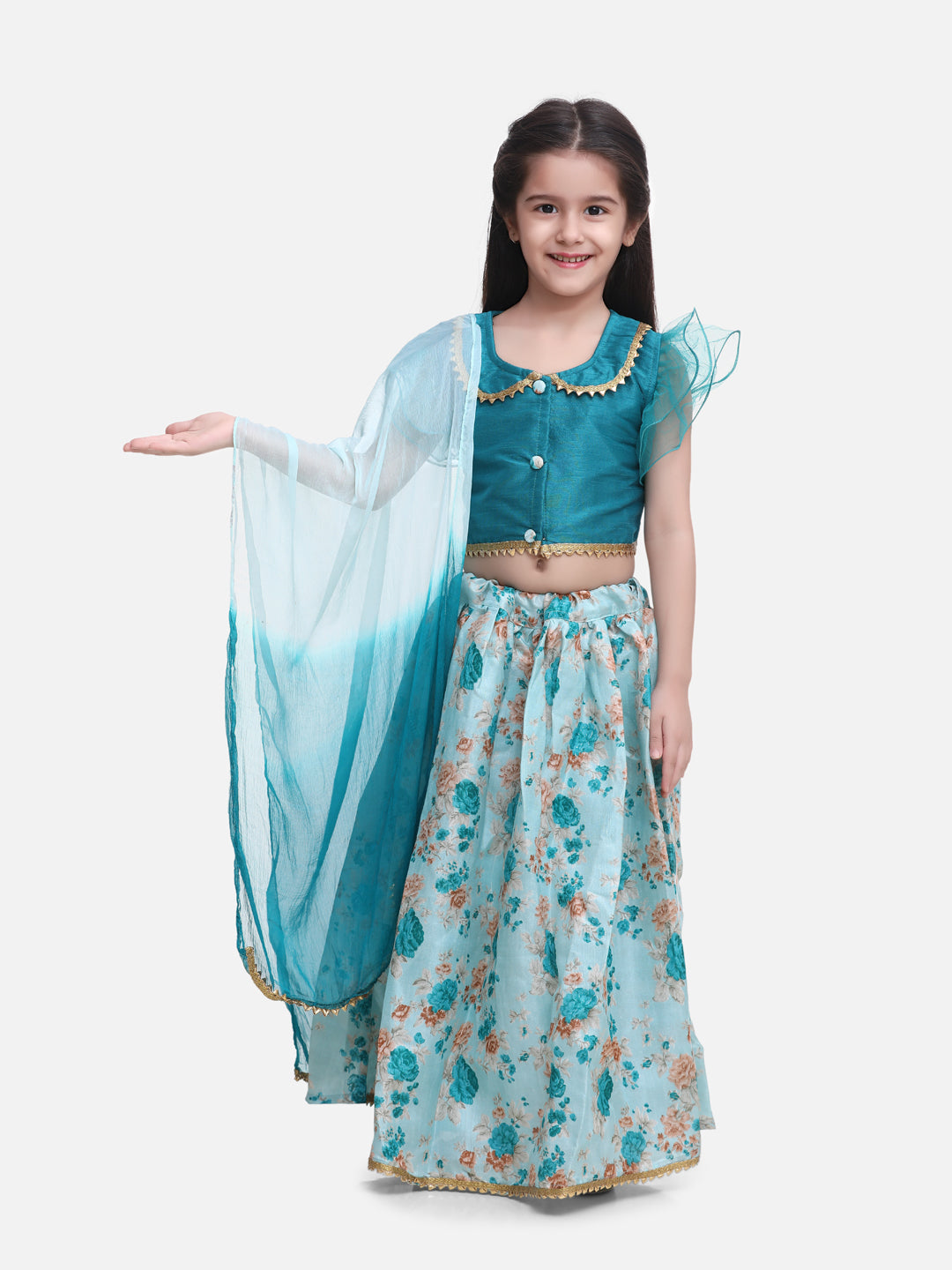 Discover the perfect ethnic look with the BownBee Ruffle Short Sleeves Choli Dupatta set. This gorgeous set features a short sleeve choli with a beautiful floral print and a lehenga with intricate ruffle detailing, completed with a vibrantly colored dupatta. Get ready for a special occasion with this stylish and sophisticated Indian ethnic ensemble.MATERIAL CARE