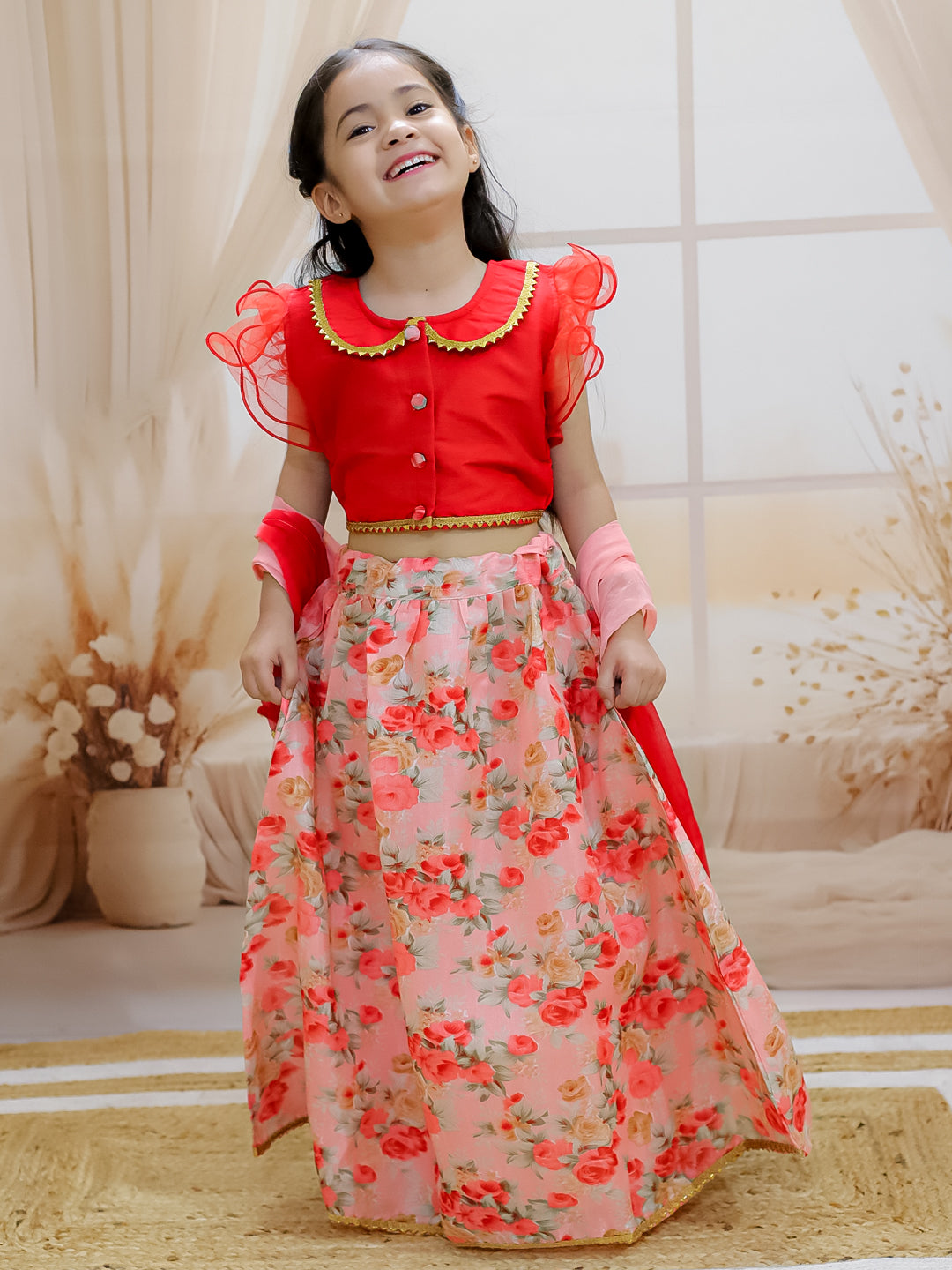 BownBee Ruffle Sleeve Collar Choli With Floral Lehenga And Dupatta For Girls - Red
