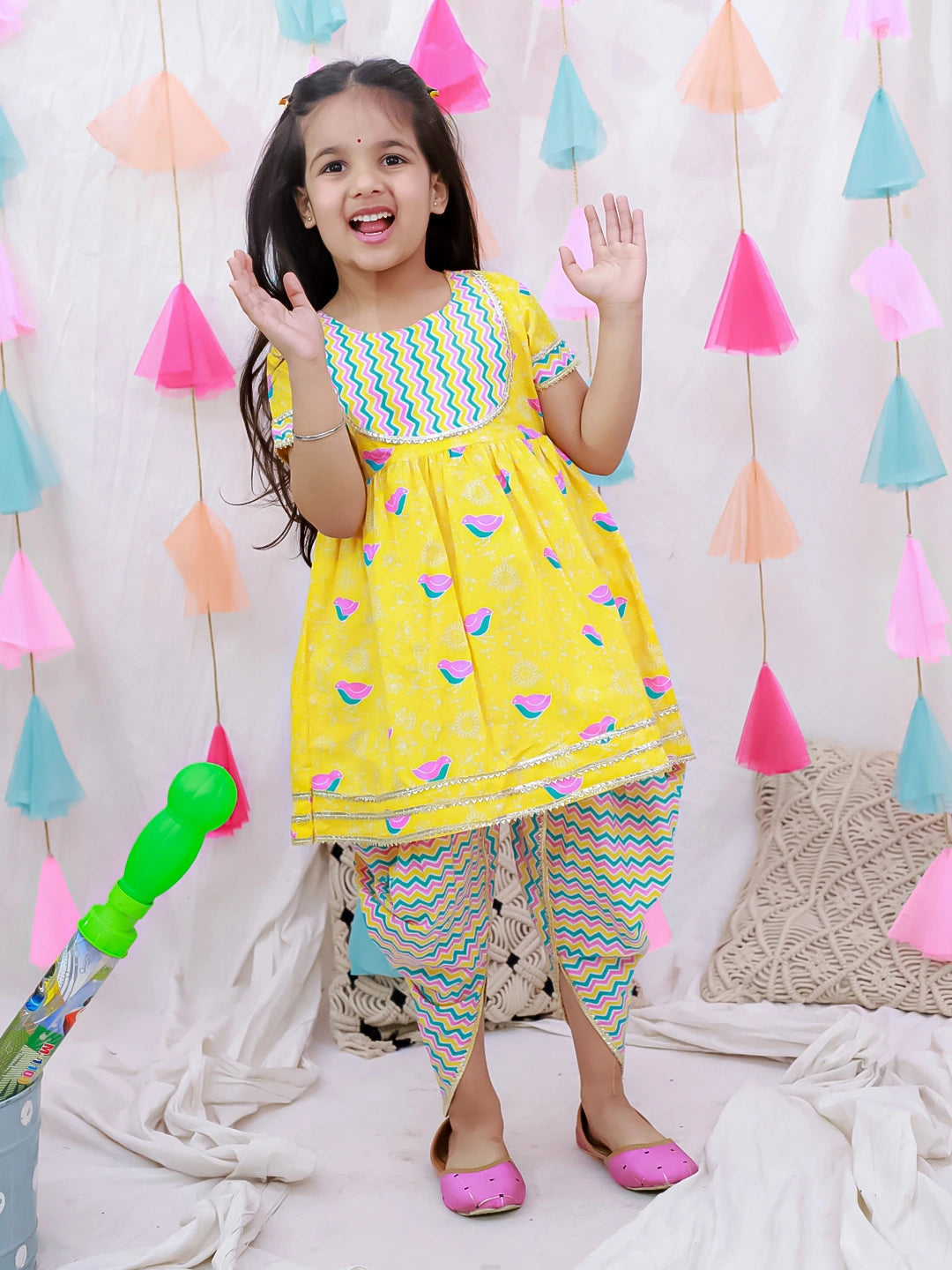 BownBee Short Sleeves Kurti With Dhoti Set For Girls - Yellow