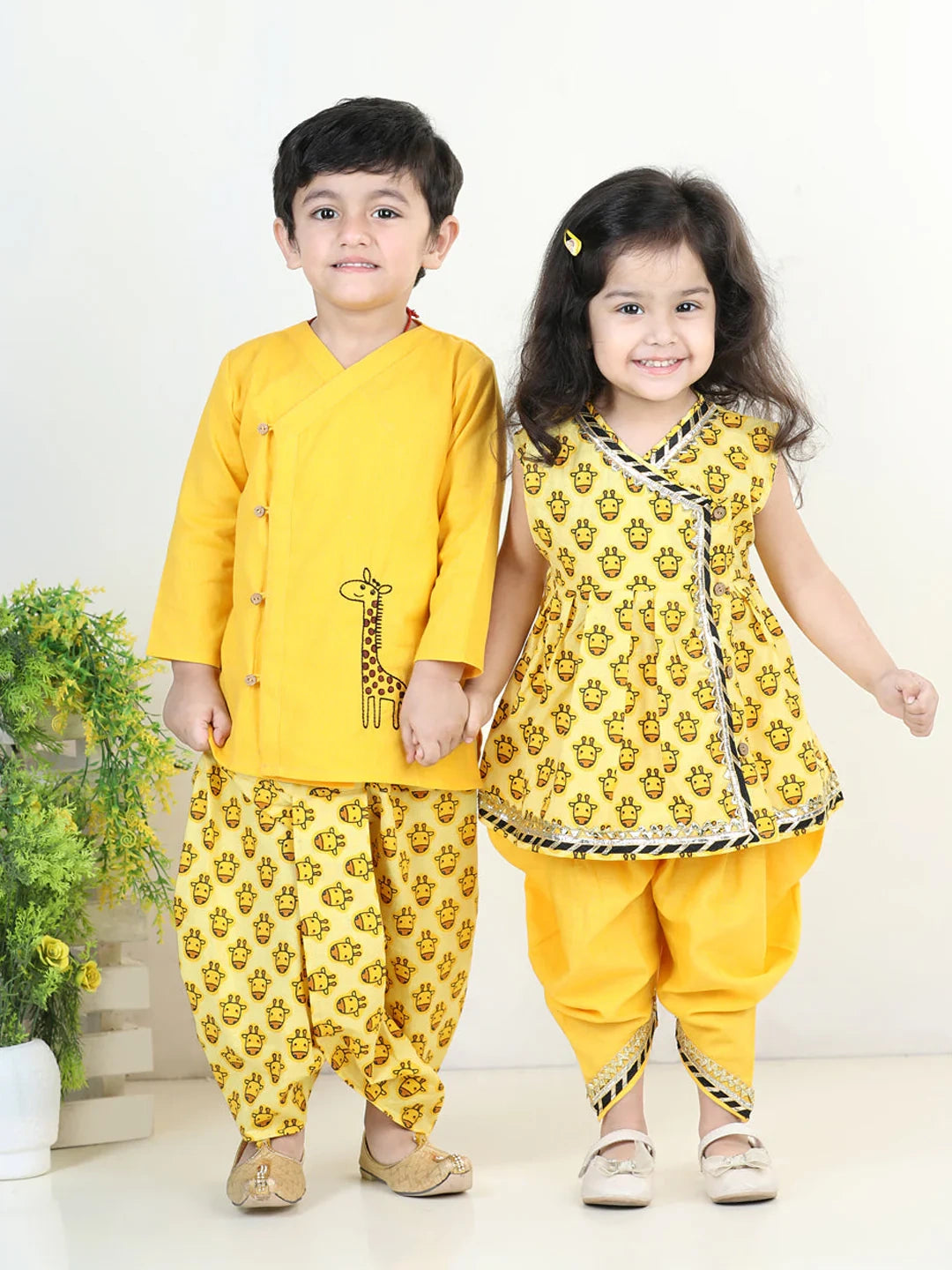 BownBee Sibling Cotton Embroidery Kurta with Printed Dhoti for Boys Printed Top with Dhoti Girls - Yellow