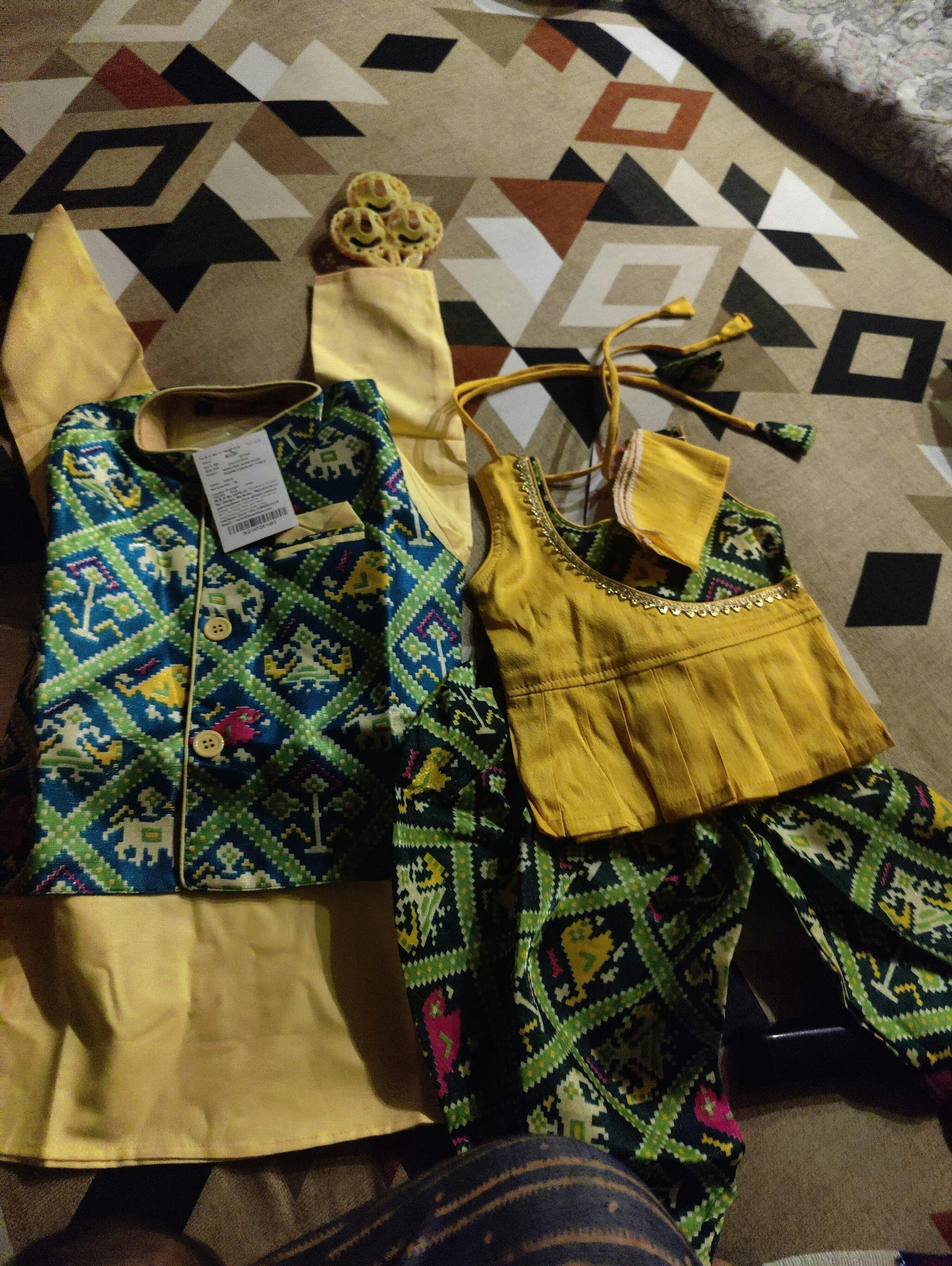 Complete your brother's traditional look with the BownBee Sibling Set of Patan Patola Jacket Kurta Pajama and Patch Top and Dhoti-Yellow. Crafted with authentic vibrant yellow Patola fabric, the set includes a Jacket Kurta Pyjama, Patch Top, and matching Dhoti. Perfect for family events or festivals, this set is sure to add a regal touch to his wardrobe.