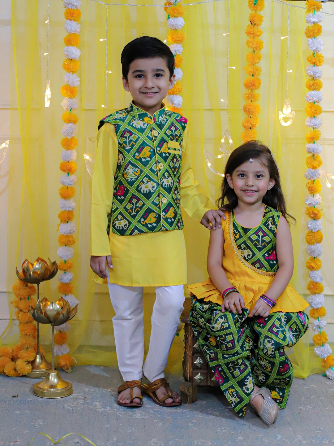 BownBee Sibling set of Patan Patola Jacket Kurta Pajama and Patch Top and Dhoti-Yellow