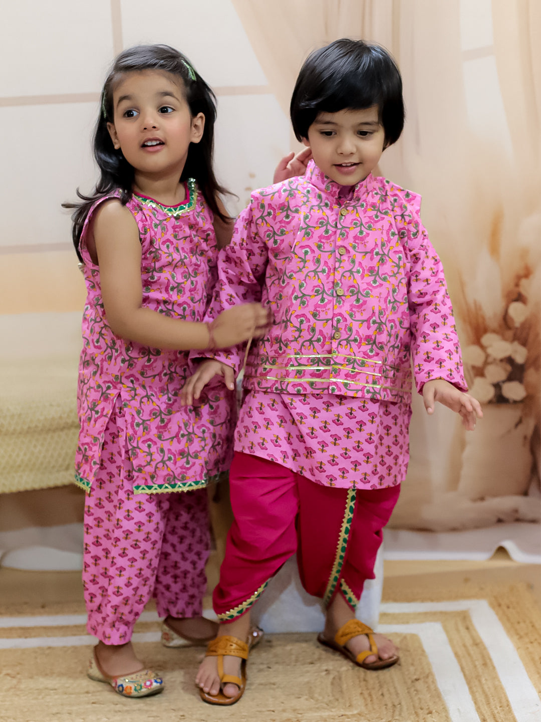 Wrap your little ones in luxury with the BownBee Sibling Set in Pink. Made from pure cotton, this set includes a stylish jacket, dhoti kurta, halter neck kurti, and harem set. Perfect for siblings, this set exudes elegance and exclusivity, enhancing your children's style and comfort.