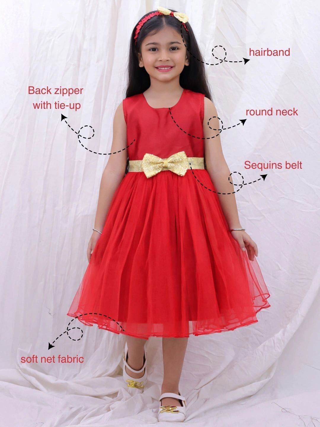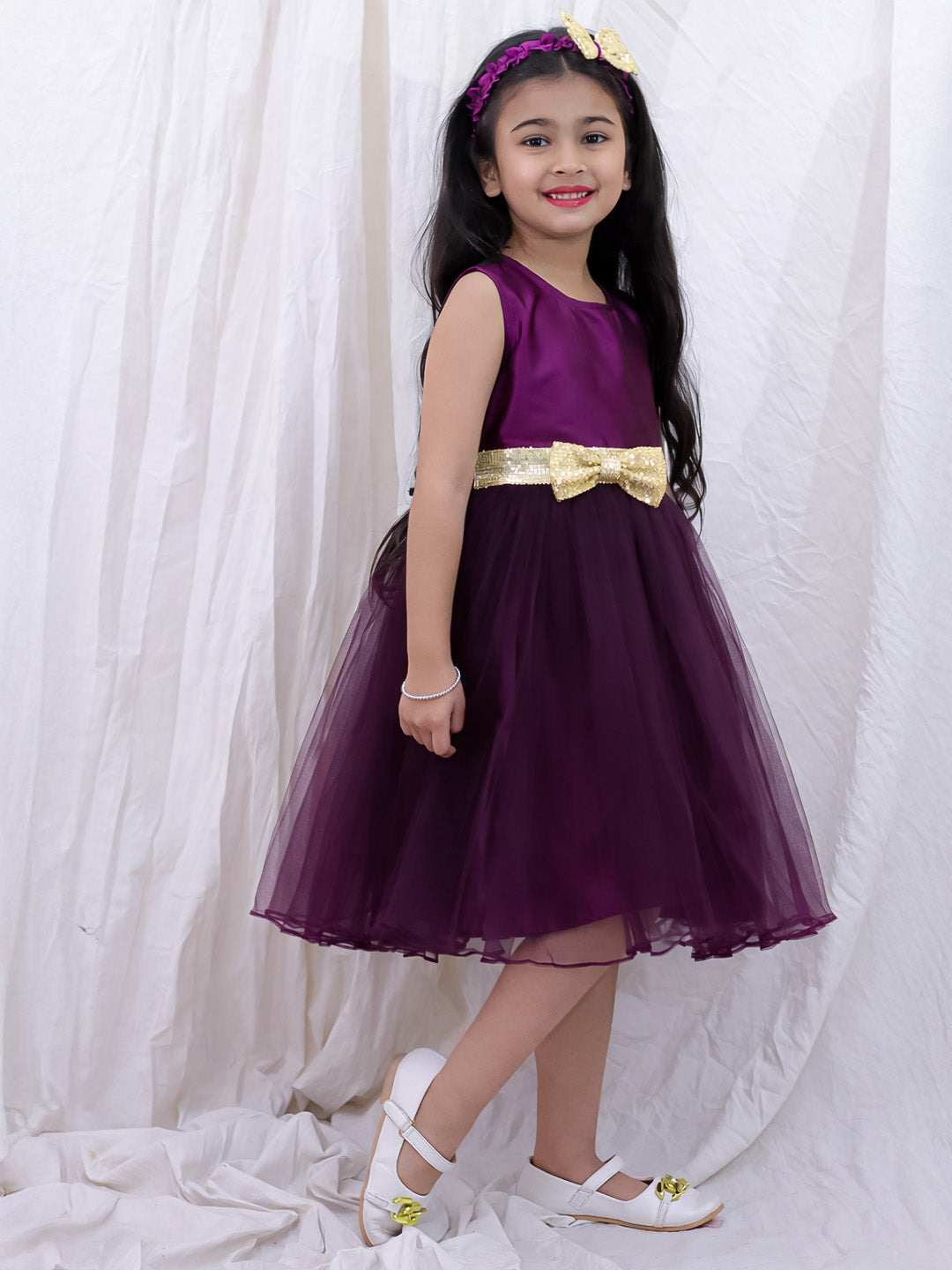 Elevate your daughter's special occasions with this exquisite sleeveless party frock crafted from premium taffeta fabric. The rich purple hue exudes elegance and timeless charm, perfect for celebrations, festivals, and formal gatherings. Designed with a flattering silhouette that allows freedom of movement, this frock features quality construction that ensures durability through countless wear. The included coordinating hairband adds a polished finishing touch, completing the ensemble effortlessly. Ideal for creating memorable moments in style.