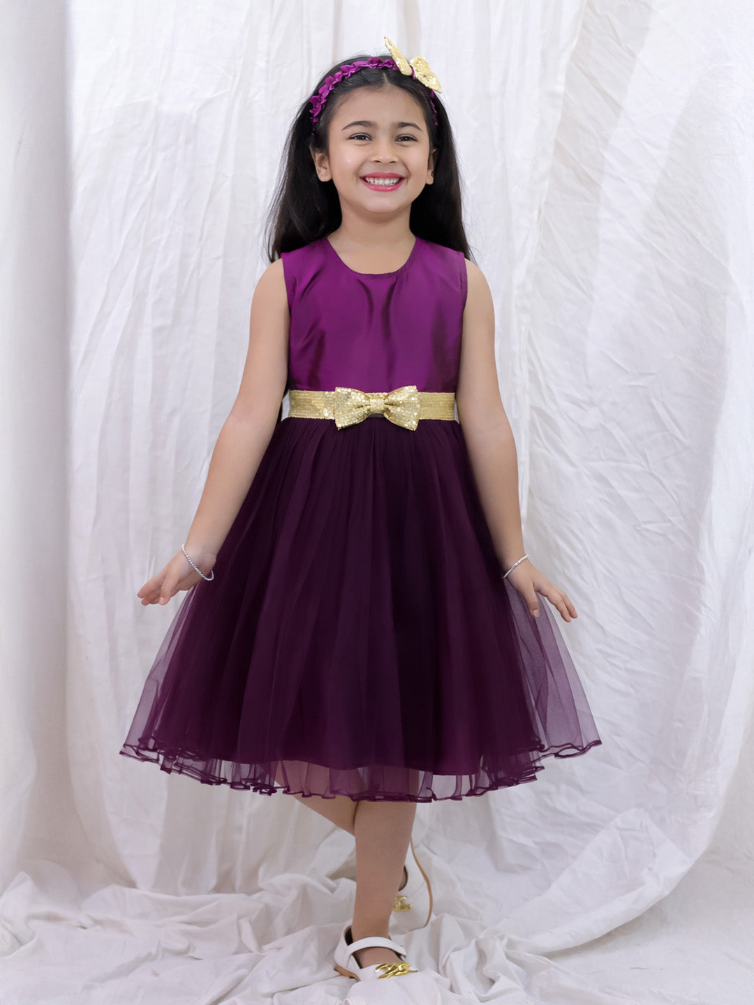 BownBee Sleeveless Taffeta Party Frock With Hairband For Girls - Purple
