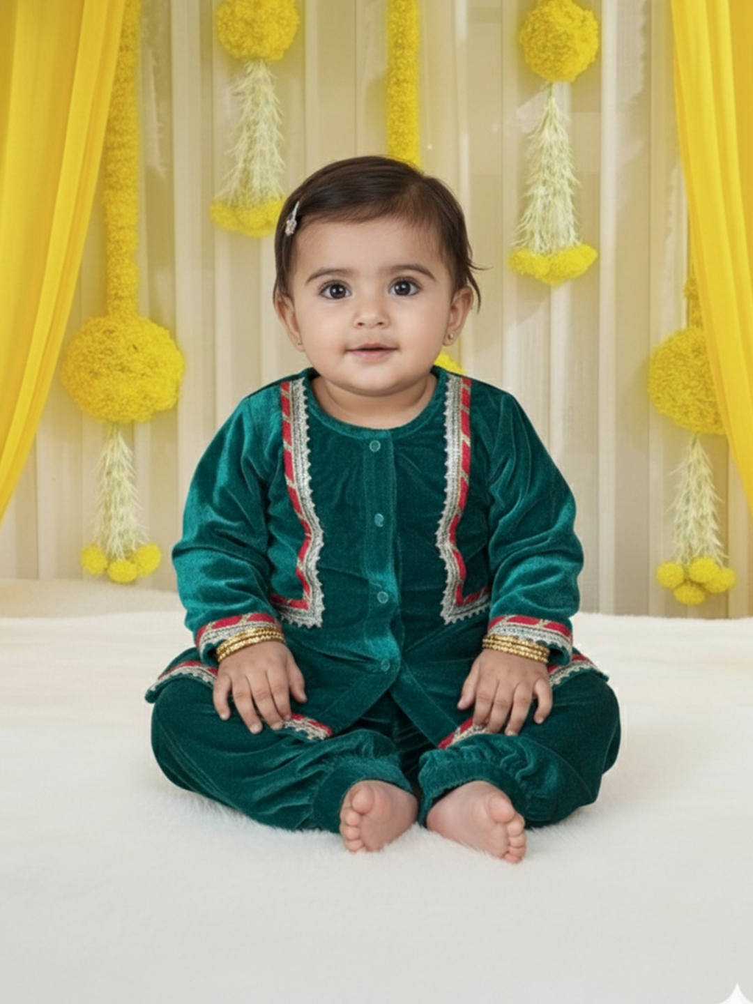 Introduce your little one to timeless elegance with this exquisite Winter Velvet Gota Suit Set. Crafted in luxurious purple velvet, this ensemble features traditional gota embroidery that adds refined detail and cultural charm. The coordinated suit set is designed for comfort and style, making it perfect for festive occasions, celebrations, and special moments. The soft velvet fabric ensures warmth during cooler months while maintaining a polished appearance. An ideal choice for parents seeking sophisticated traditional wear that celebrates Indian heritage with contemporary grace.